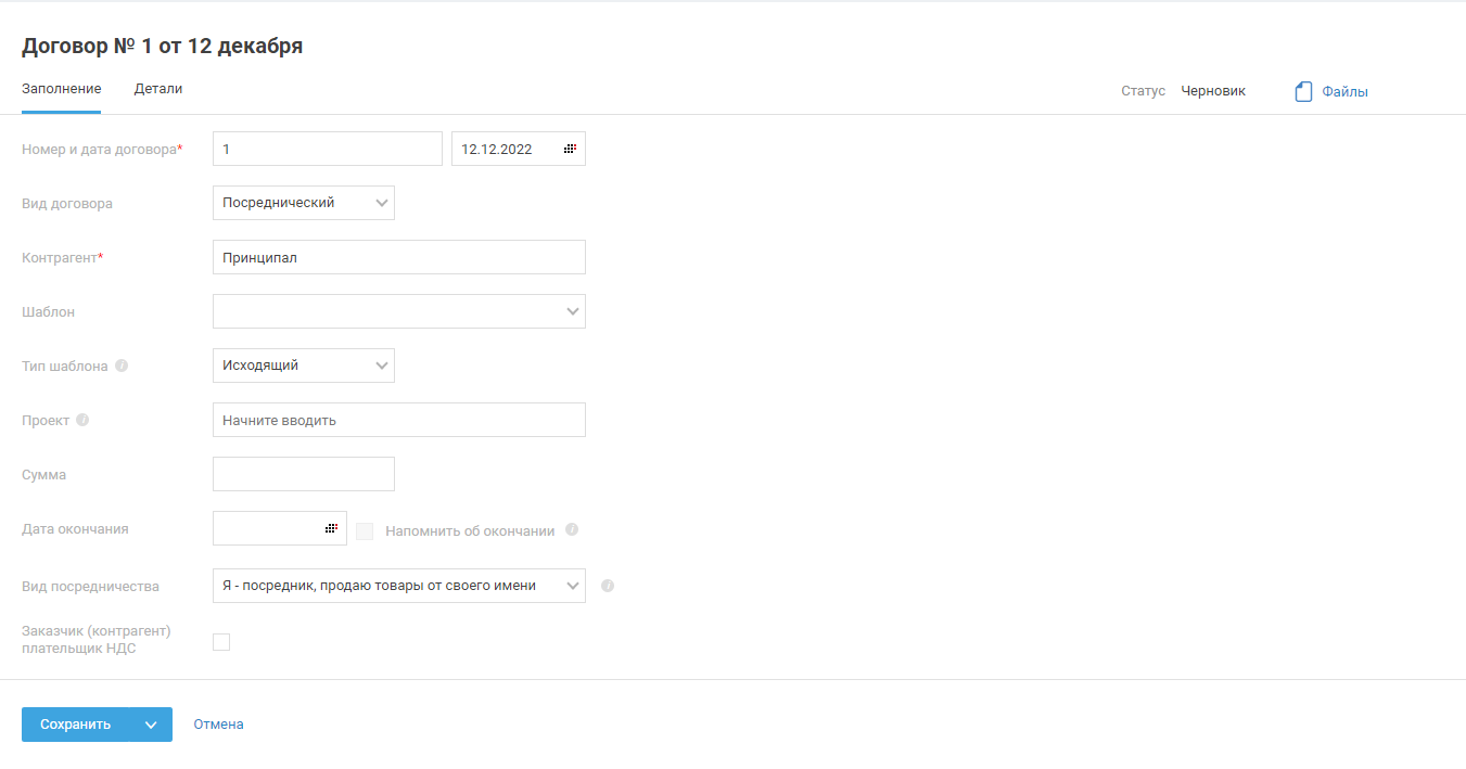 - Посреднический договор — ранее созданный посреднический договор из списка или начните печатать его номер.