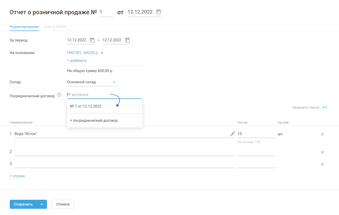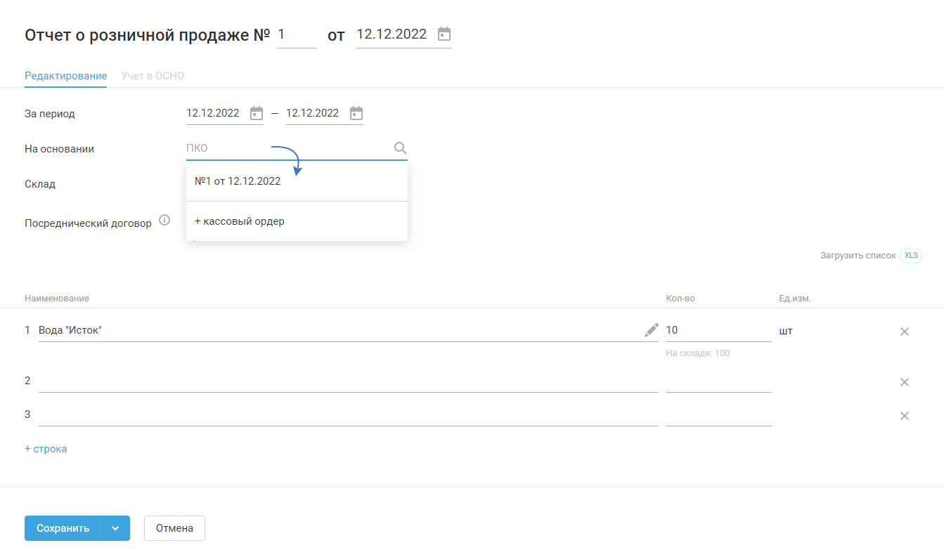После сохранения поступления свяжите его с отчётом о розничной продаже. Для этого в форме отчёта о розничной продаже в режиме «Заполнение» в поле «На основании» выберите ранее созданное поступление и сохраните отчёт о розничной продаже.