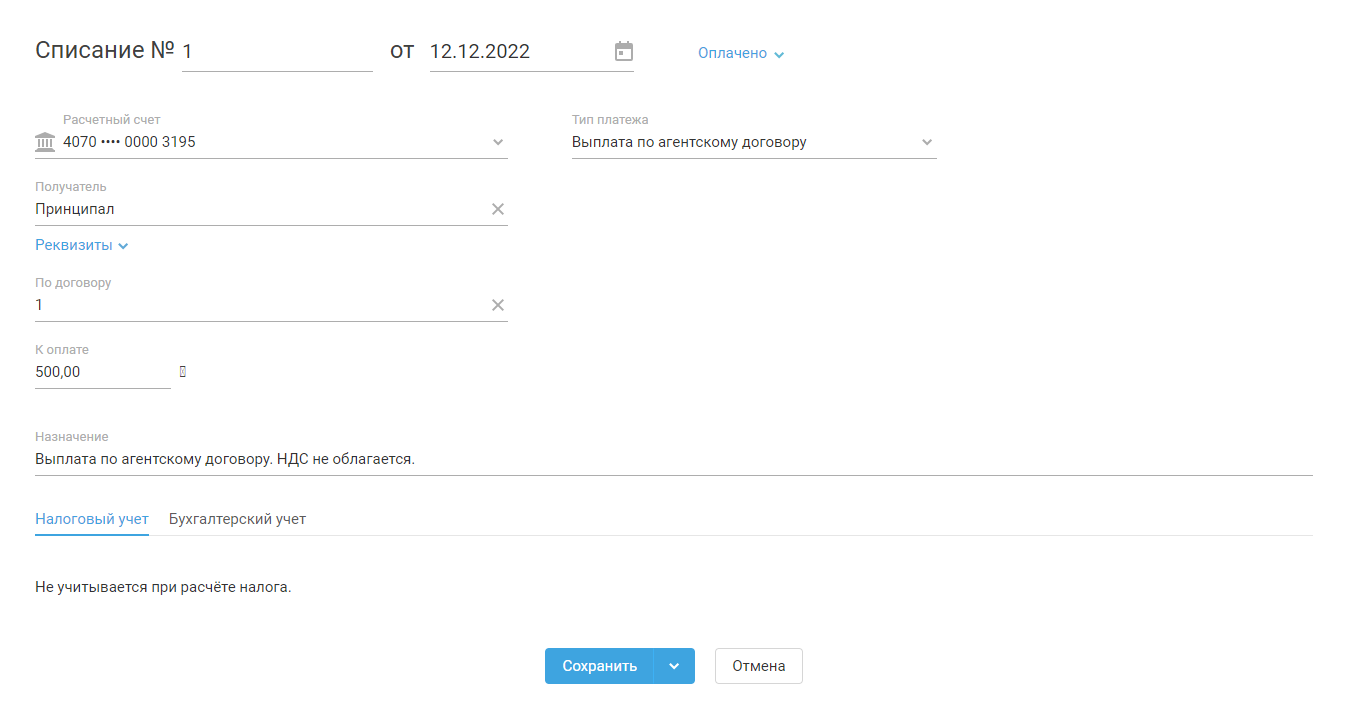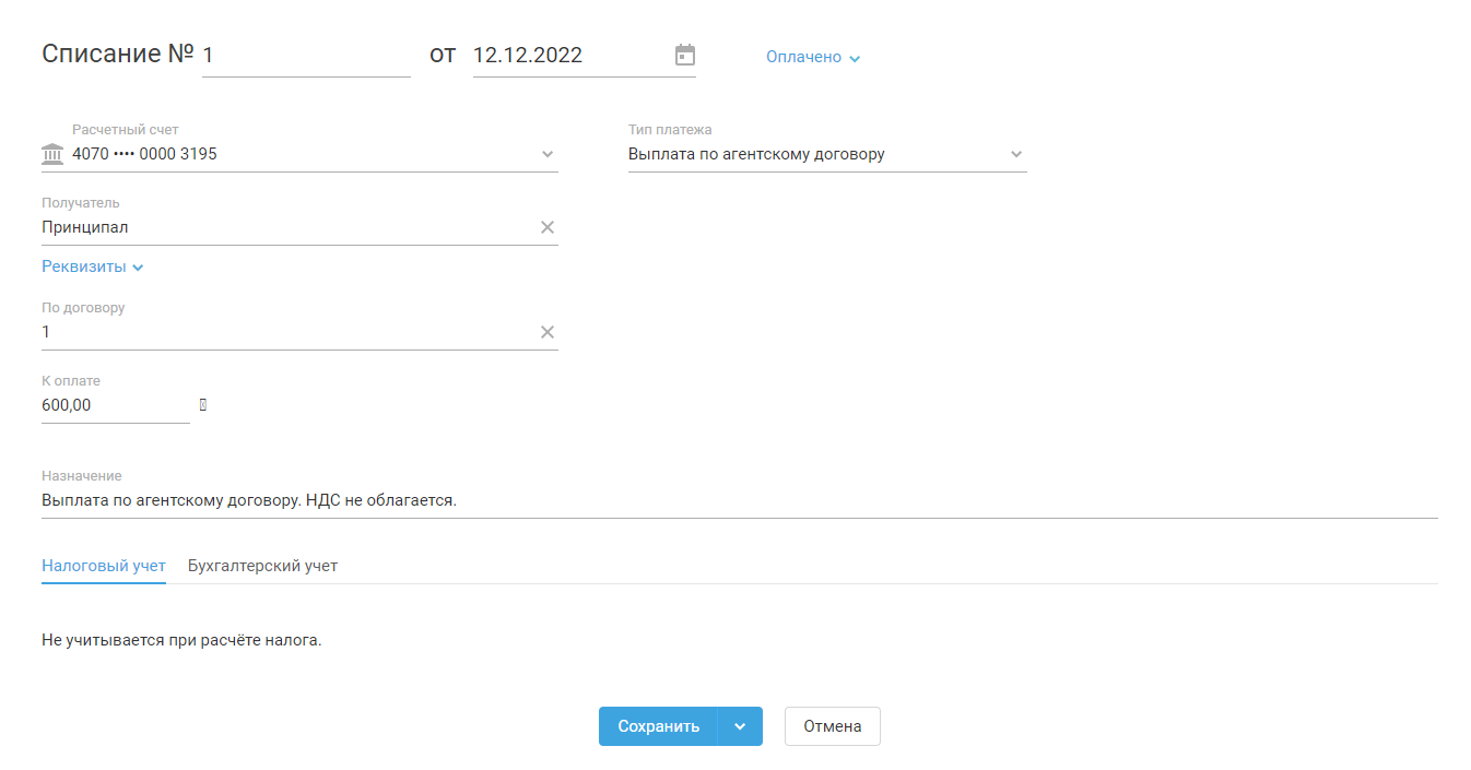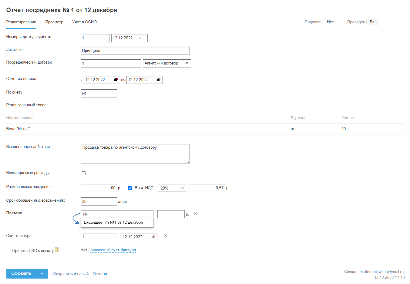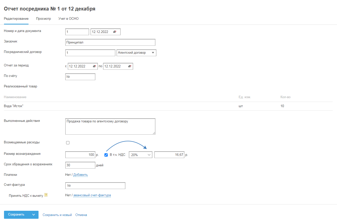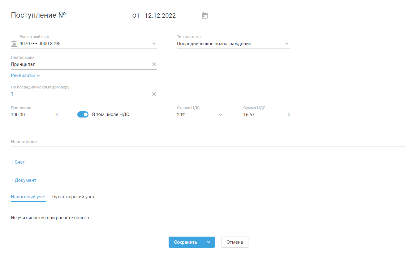 НДС. Чекбокс по умолчанию выключен. При необходимости выделения НДС включите чекбокс и выберите ставку. Сумма НДС рассчитается автоматически по указанной процентной ставке, далее заполните реквизиты (дату и номер) счёта-фактуры, выставляемой вами в адрес принципала (комитента).