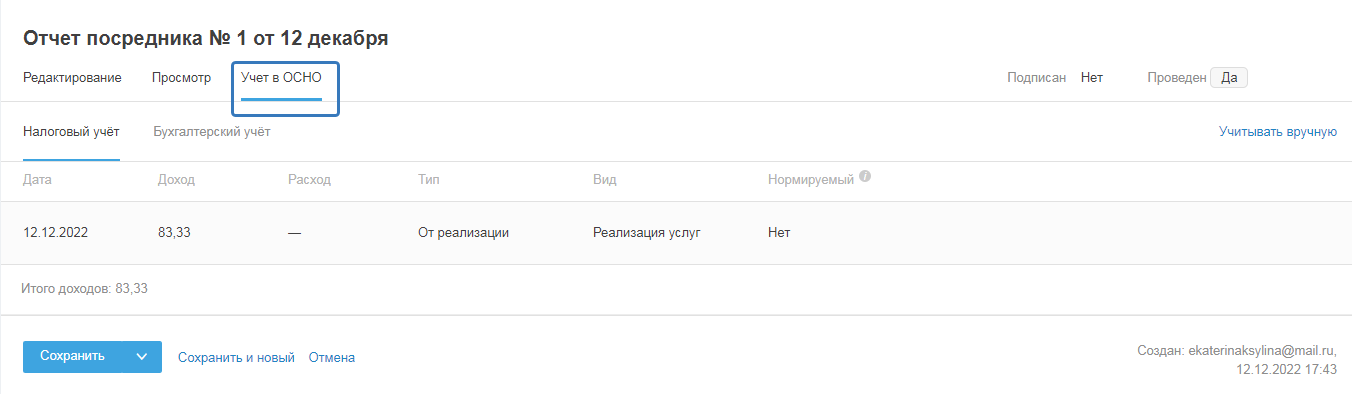 После сохранения отчёта посредника, перейдите во вкладку «Учёт», в блоке «Налоговый учёт» отображаются данные для расчёта налога на прибыль организаций. Убедитесь, чтобы в графе «Доход» учитывалось значение вознаграждения за вычетом НДС (100 - 16,67 = 83,33).