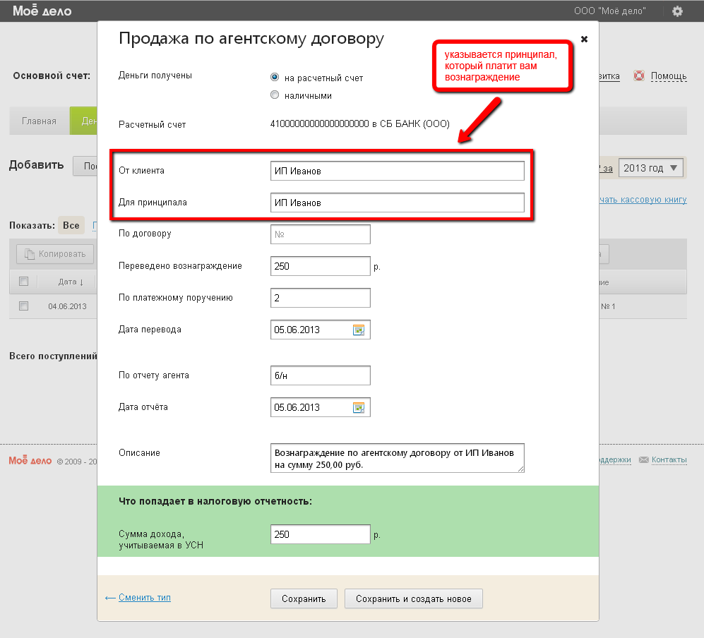 «Для принципала»: из выпадающего списка выберите принципала для которого получены денежные средства