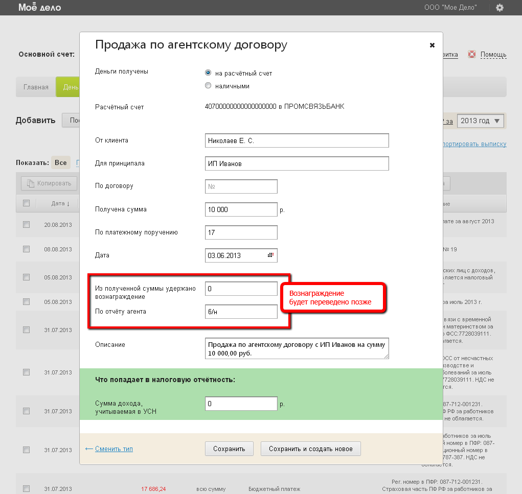«Из полученной суммы удержано вознаграждение»: укажите сумму вашего вознаграждения, которое согласно агентскому договору, удерживается в день получения денежных средств от клиента.