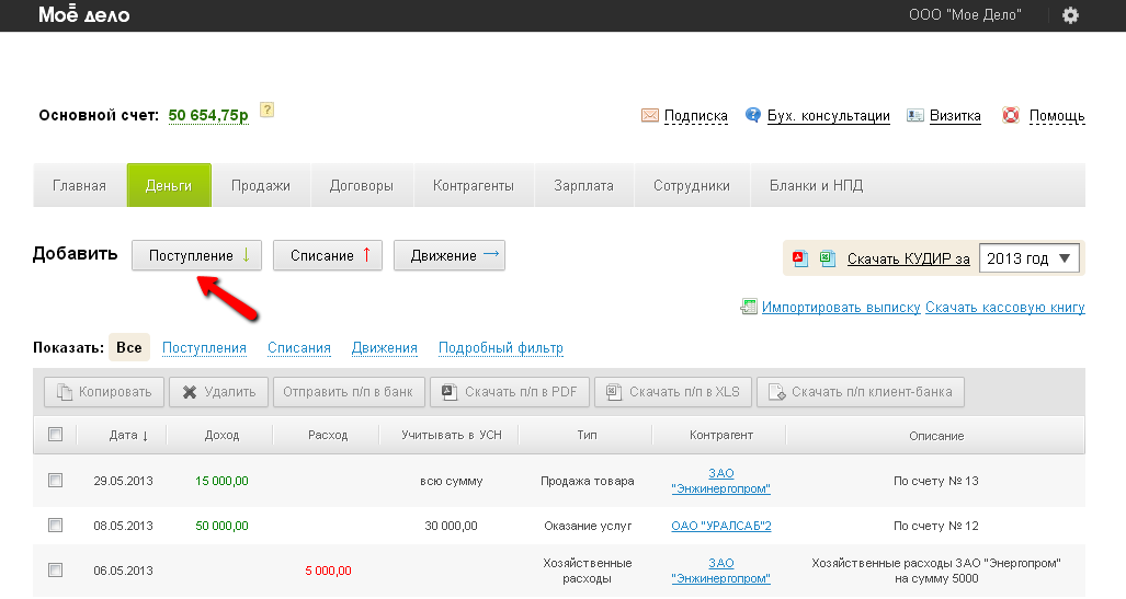 В разделе «Деньги» нажмите кнопку Добавить «Поступление».