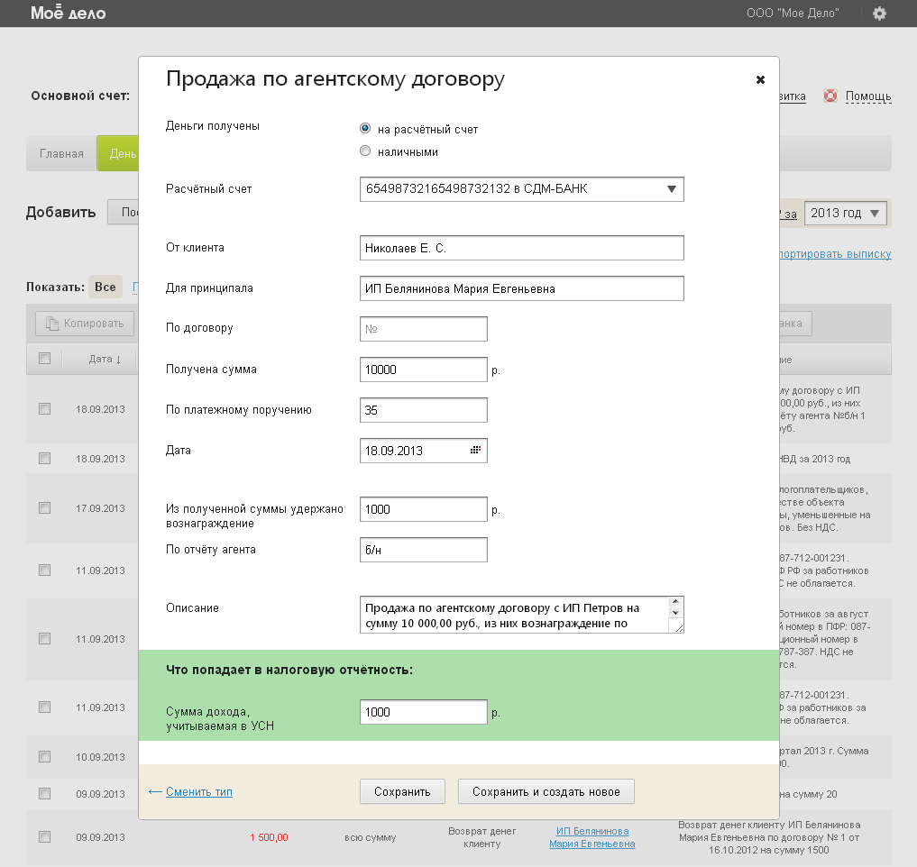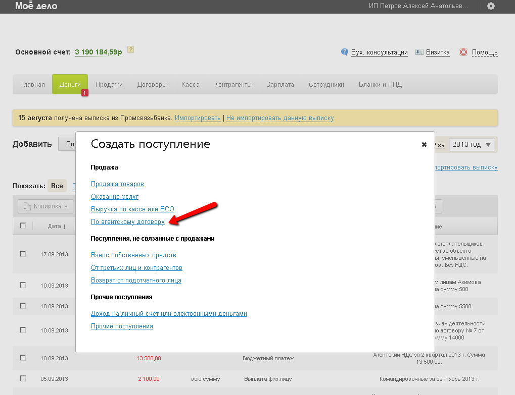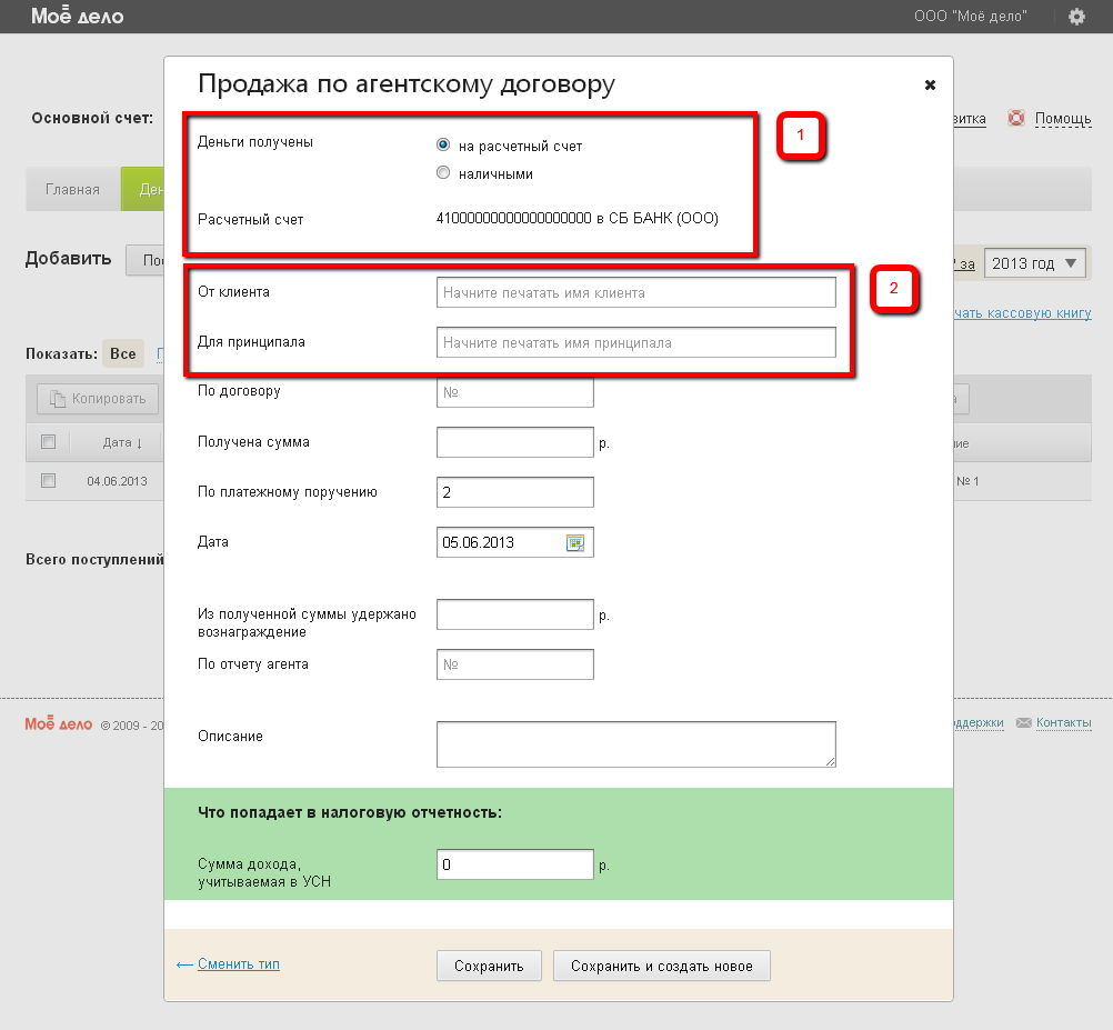 Если у вас заключен агентский договор, по которому вы являетесь агентом и принимаете денежные средства для принципала за вознаграждение, тогда используйте тип поступления «По агентскому договору».