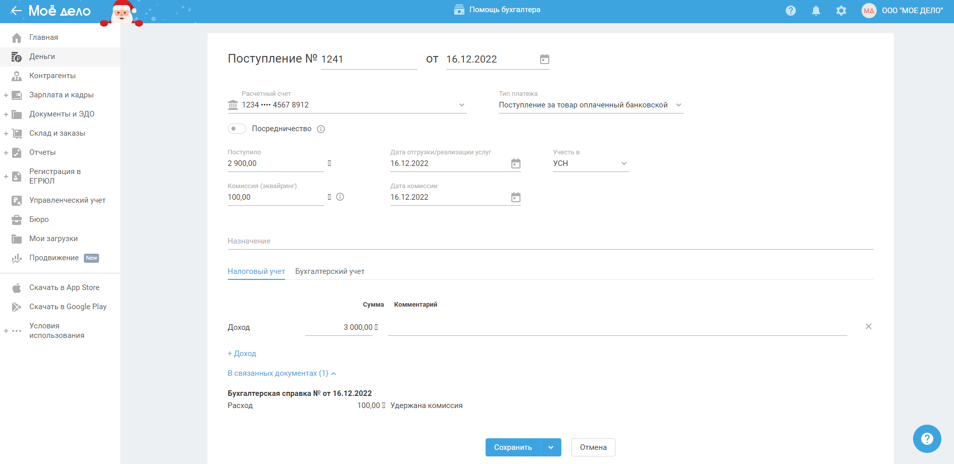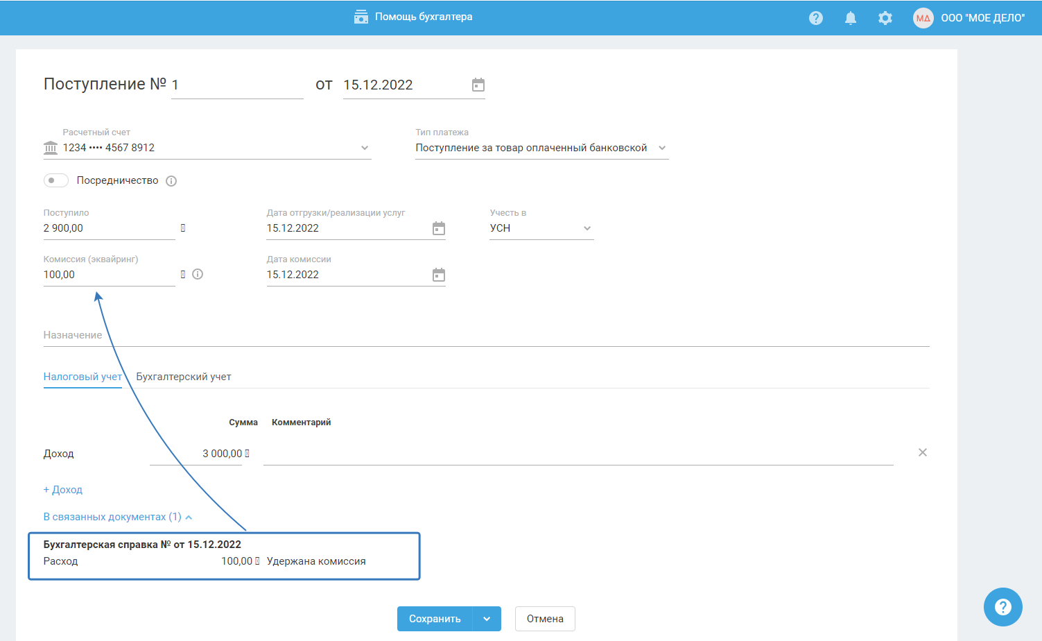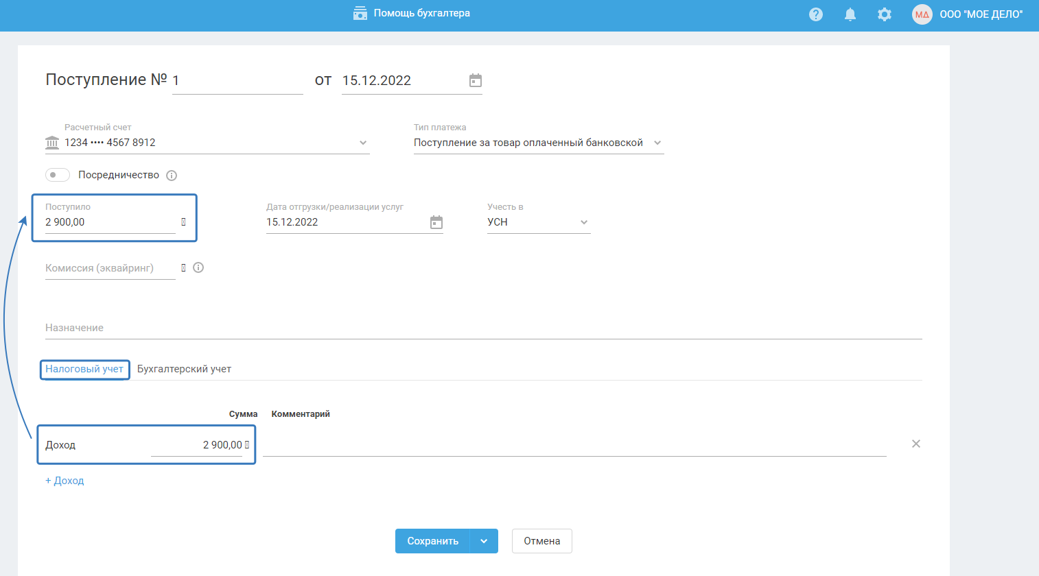 Если значение в поле "Комиссия (эквайринг)" не будет заполнено, то сумма дохода будет равна значению в поле "Поступило".