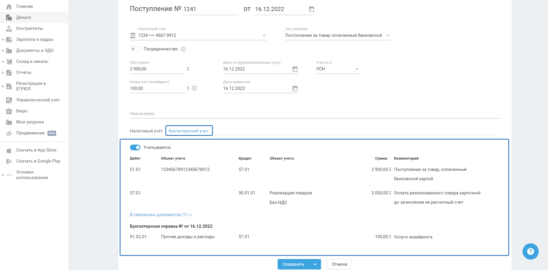 – Учесть в. Поле доступно при совмещении УСН+ПСН или ОСНО+ПСН. Выберите тот режим, к которому относится выручка. Например, выручка получена в магазине на ПСН, в поле необходимо выбрать режим ПСН. Если часть денег по одной системе налогообложения, а часть – по другой, то нужно создать две отдельные операции с типом «Поступление за товар, оплаченный банковской картой», где в каждой выбрать свой режим.