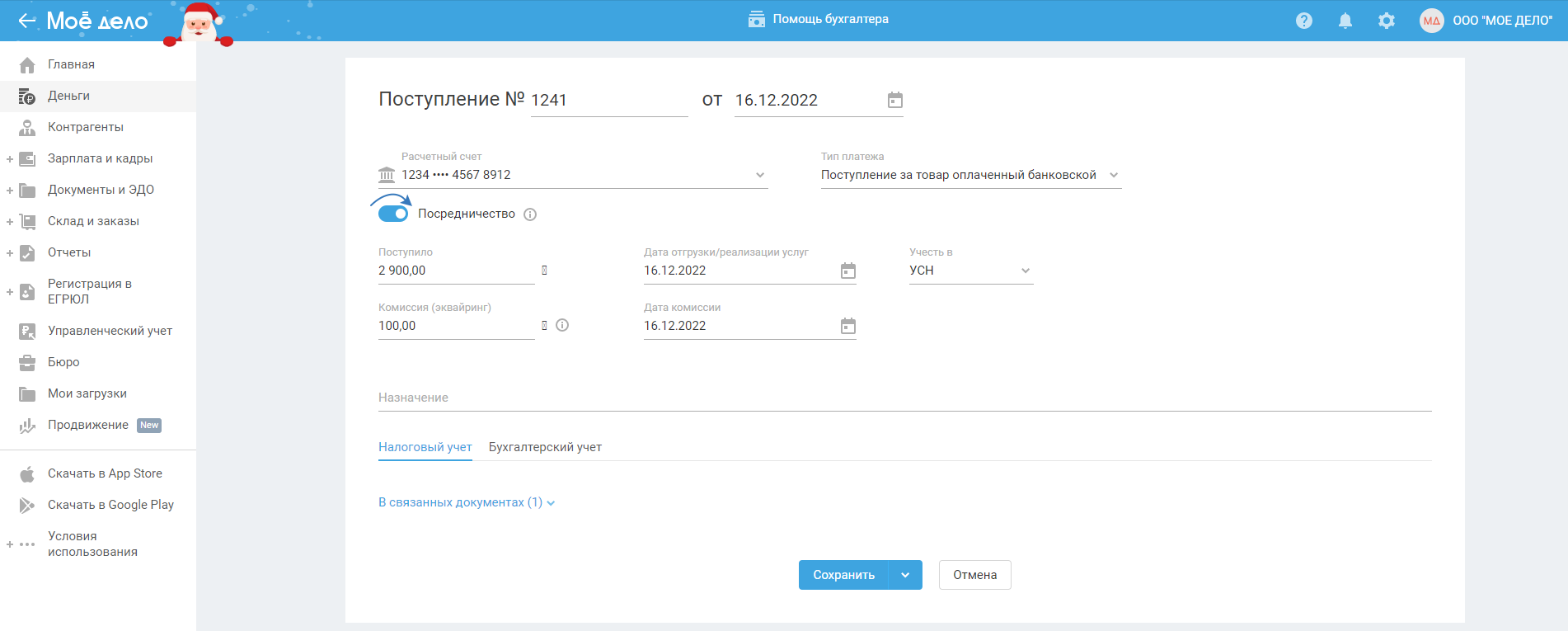 Если ИП/ООО на УСН является посредником и получает денежные средства с помощью эквайринга, то для того, чтобы эта сумма не шла в доход, необходимо включить тумблер "Посредничество".