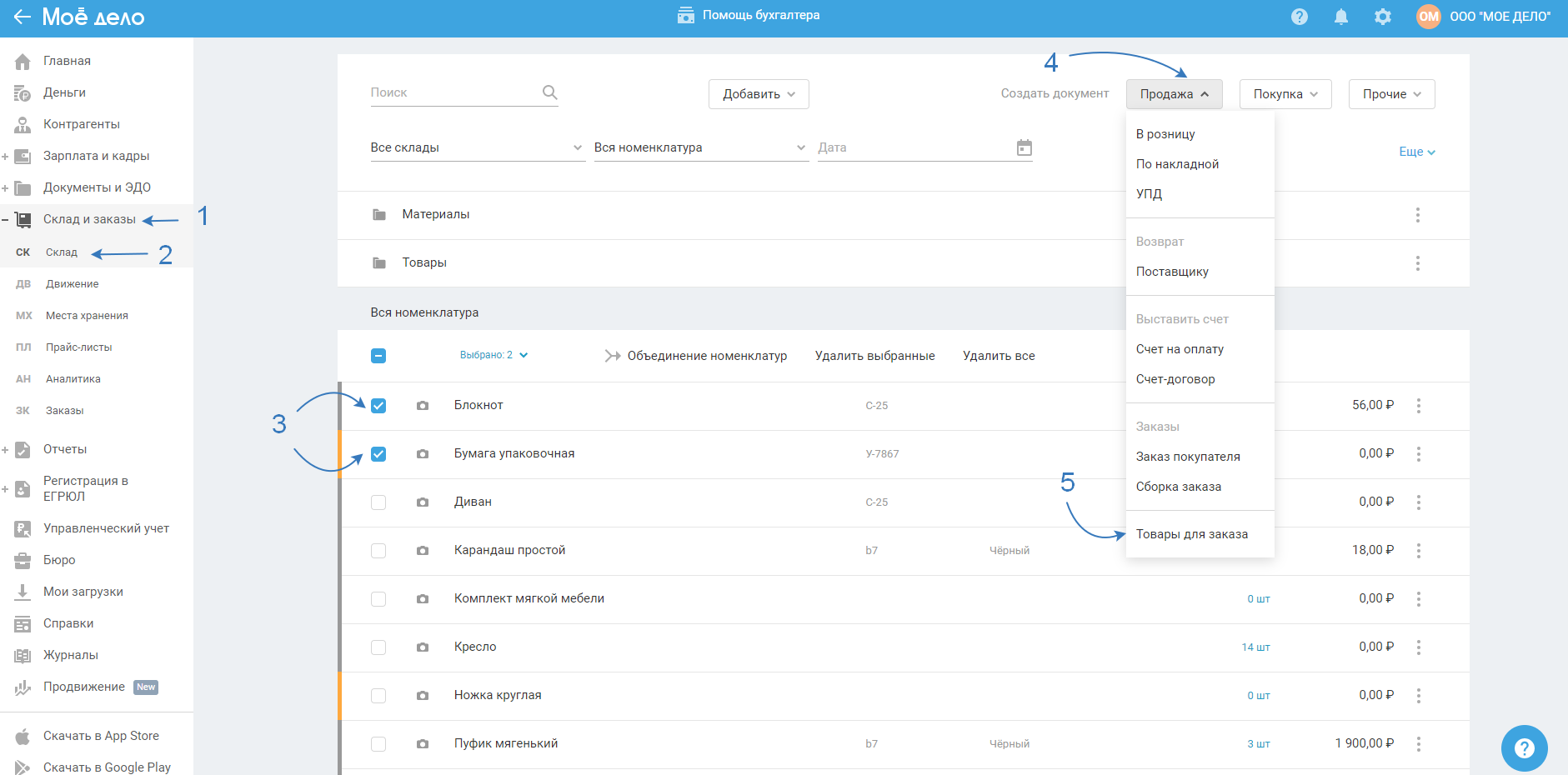 Для того чтобы создать список товаров для заказа покупателю по имеющейся в сервисе номенклатуре товаров, перейдите в раздел Склад и заказы — Склад, выберите номенклатуры (поставьте галки слева от наименований товаров) и нажмите на кнопку «Продажа — Товары для заказа»: