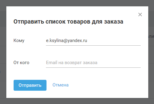 В открывшемся окне в поле «Кому» (обязательно для заполнения) укажите адрес электронной почты клиента. В поле «От кого» (заполнять необязательно) укажите адрес электронной почты на которую поступит заказ от клиента, если поле не заполнено, то по умолчанию будет использоваться логин (e-mail) для входа в сервис «Моё дело». После того как все поля будут заполнены, нажмите на кнопку «Отправить»: