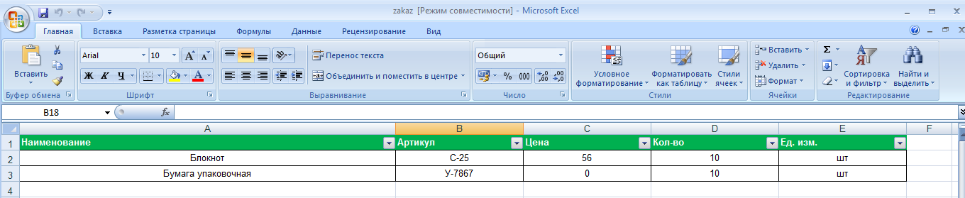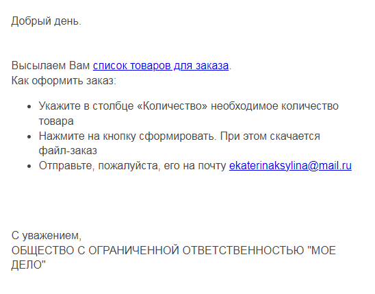 В результате скачается список товаров для заказа, которые хочет приобрести у вас покупатель, в формате xls. В нём будут указаны: наименование товара, артикул, единица измерения, количество и цена: