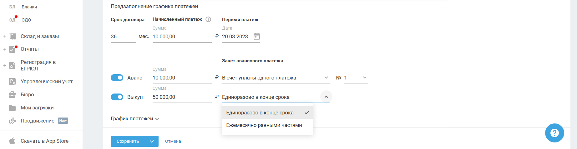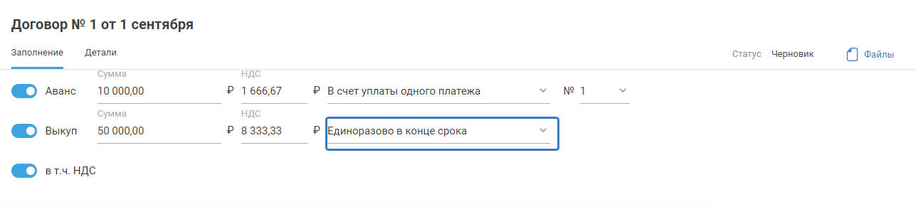 Рассмотрим на примере. В договоре активен переключатель «Выкуп» и сумма выкупа установлена в размере 100 000 руб.