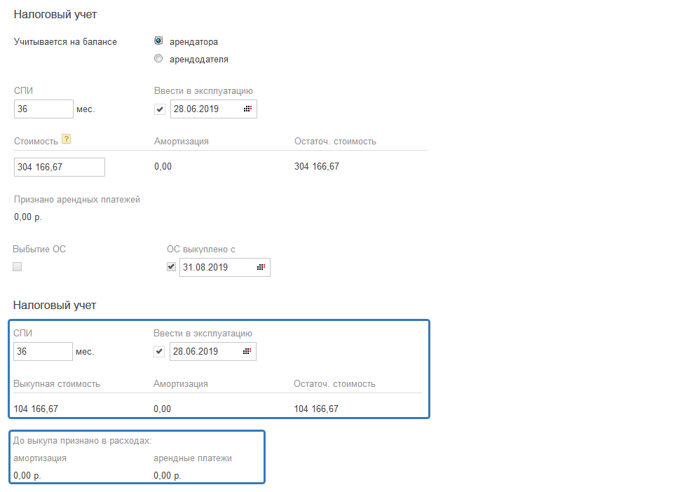 Поставьте галку в строке «ОС выкуплено с». В блоке «Налоговый учёт» в строках «До выкупа признано в расходах» будут указаны значения амортизации и арендных платежей: