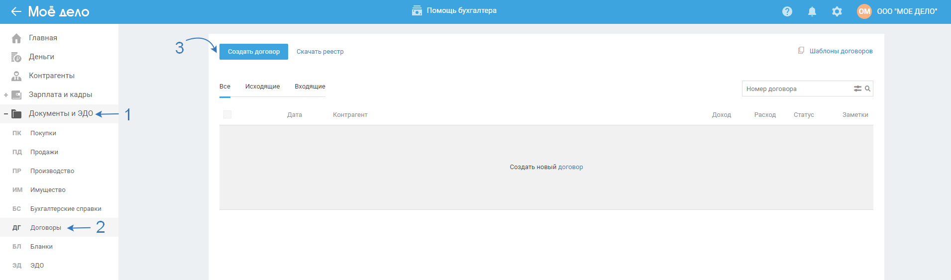 Перейдите в раздел «Документы и ЭДО — Договоры» и нажмите на кнопку «Создать договор»: