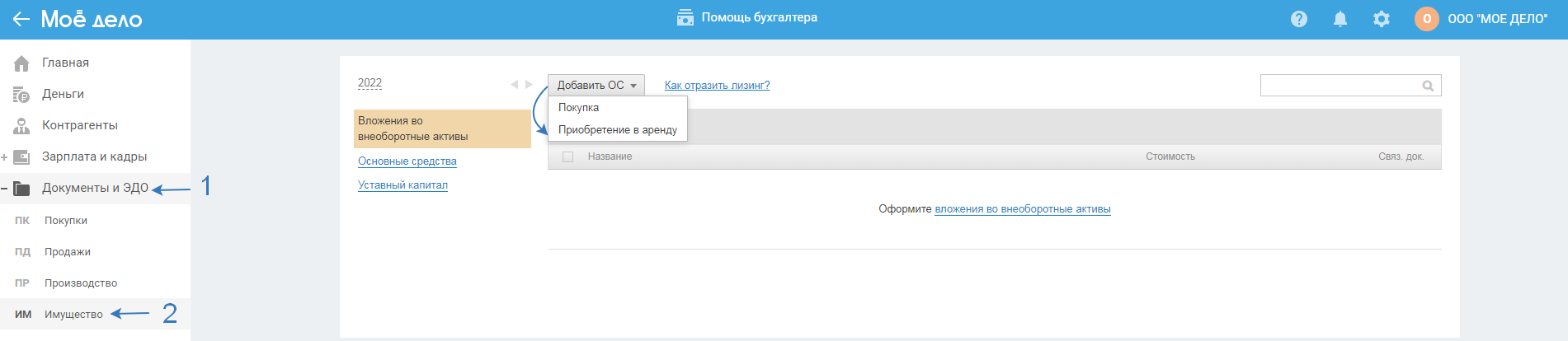 Перейдите в раздел «Документы и ЭДО — Имущество», нажмите на кнопку «Добавить ОС» и выберите в появившемся списке пункт — «Приобретение в аренду»: