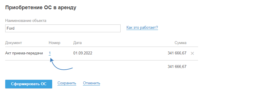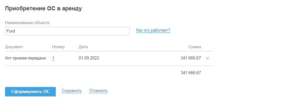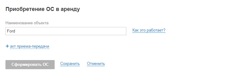 В открывшемся окне «Приобретение ОС в аренду» введите название объекта аренды (лизинга) в строку «Наименование объекта», после чего нажмите на ссылку «акт приёма-передачи».