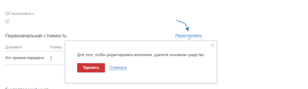 В блоке «Первоначальная стоимость» представлен акт приёма-передачи на основании которого заполняется Инвентарная карточка. Для его редактирования нажмите на ссылку «Редактировать» и в появившемся окне подтверждения удаления нажмите на кнопку «Удалить», при этом все ранее заполненные поля инвентарной карточки (инвентарный номер, ОКОФ и т.д.) будут удалены. Или кликнуть на номер акта приёма-передачи и внести изменения.