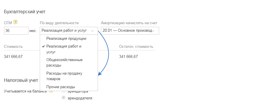В поле «Стоимость» укажите первоначальную стоимость имущества, являющегося предметом лизинга. Обратите внимание, что первоначальная стоимость предмета лизинга для налогового и бухгалтерского учёта формируются по-разному. Так стоимость для целей бухгалтерского учёта будет соответствовать общей сумме платежей без НДС, подлежащей уплате лизингодателю по договору, в то время как для налогового учёта первоначальной стоимостью будут являться суммы расходов лизингодателя на его приобретение, сооружение, доставку, изготовление и доведение до состояния, в котором оно пригодно для использования. Данная информация отдельно указывается в договоре аренды (лизинга).