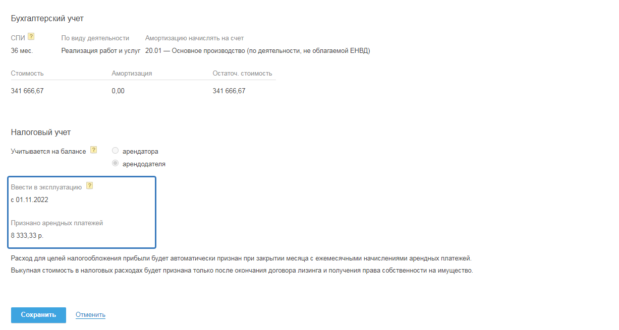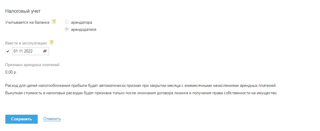 Амортизация начисляется, начиная с месяца, следующего за месяцем ввода в эксплуатацию. Если в строке «Ввести в эксплуатацию» не указана дата, тогда для целей налогообложения прибыли будет учитываться сумма ежемесячных арендных платежей согласно графику платежей договора аренды (лизинга).