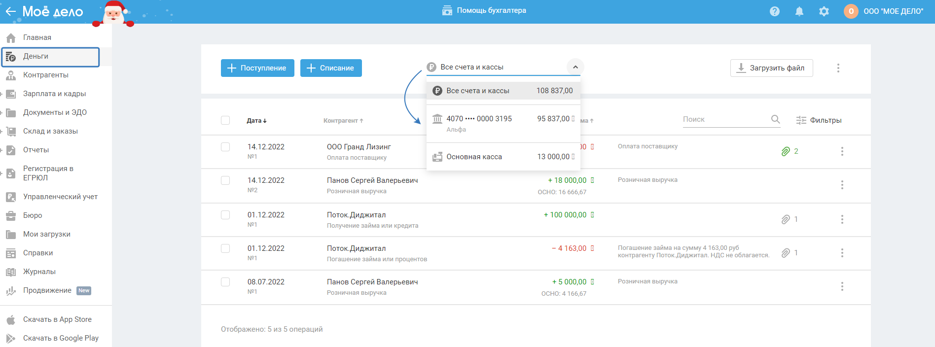 5. Уплаченные арендные платежи отразите в разделе «Деньги» как списание с типом «Арендный платёж».