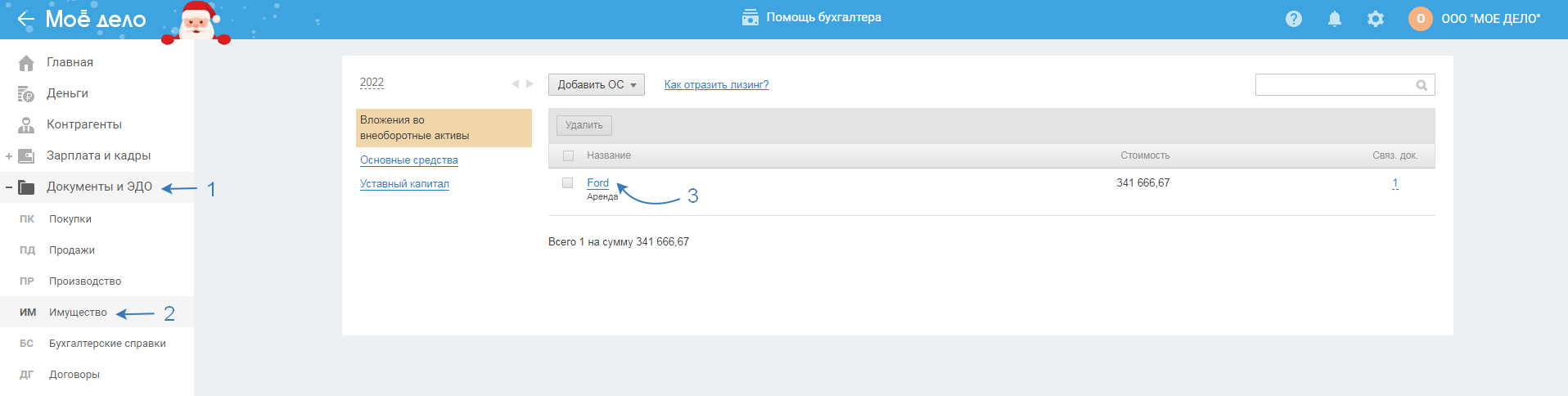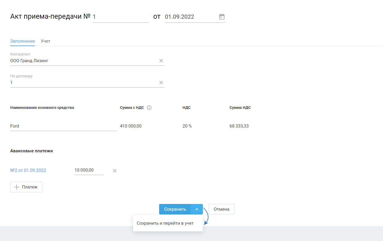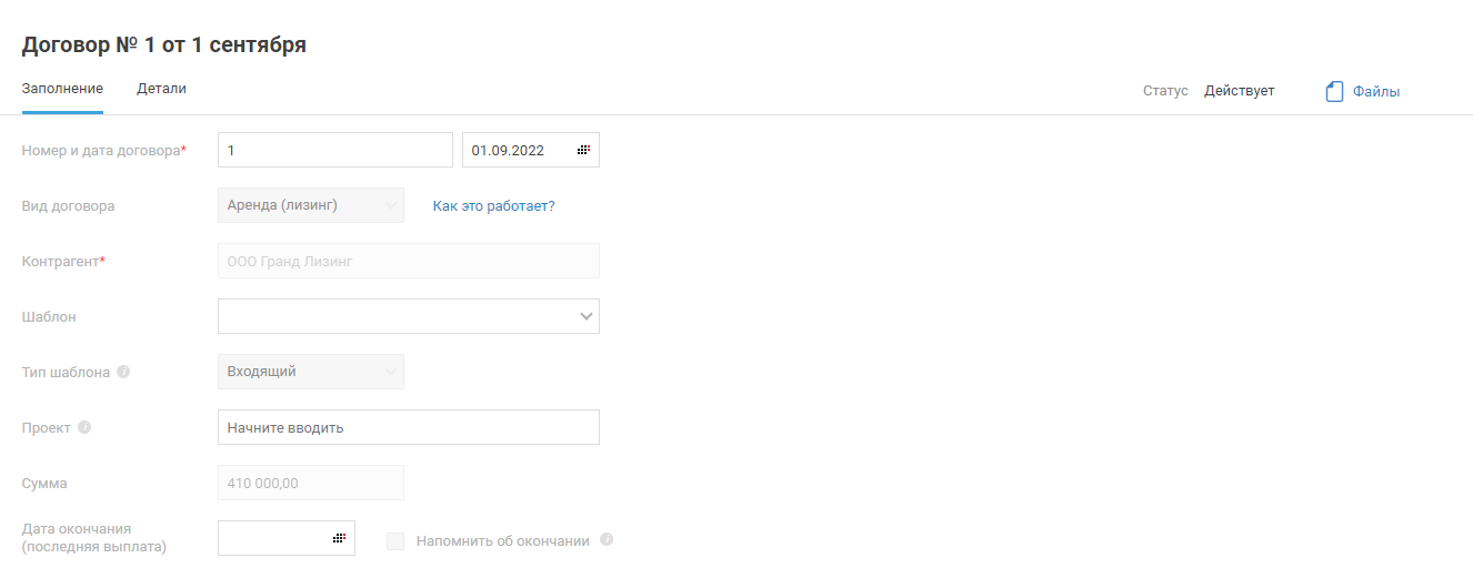 1. Создайте в сервисе договор аренды (лизинга). Подробное описание можно посмотреть в этой же инструкции.