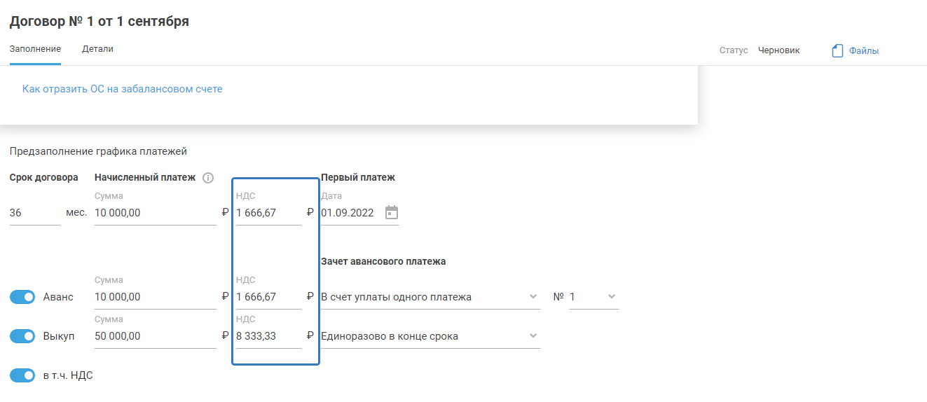 Графа «в т.ч. НДС»также считается для включенных строк (переключатель в правом положении) «Аванс» и «Выкуп». Если в договоре указана цена без НДС, тогда переведите переключатель «в т.ч. НДС» в левое положение.