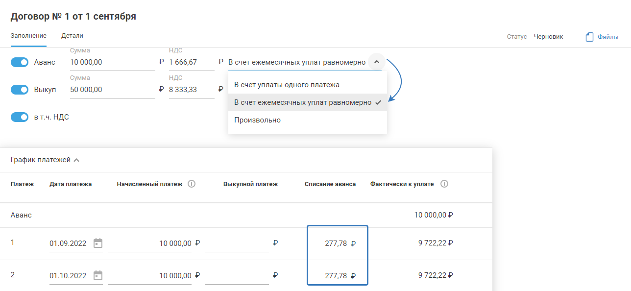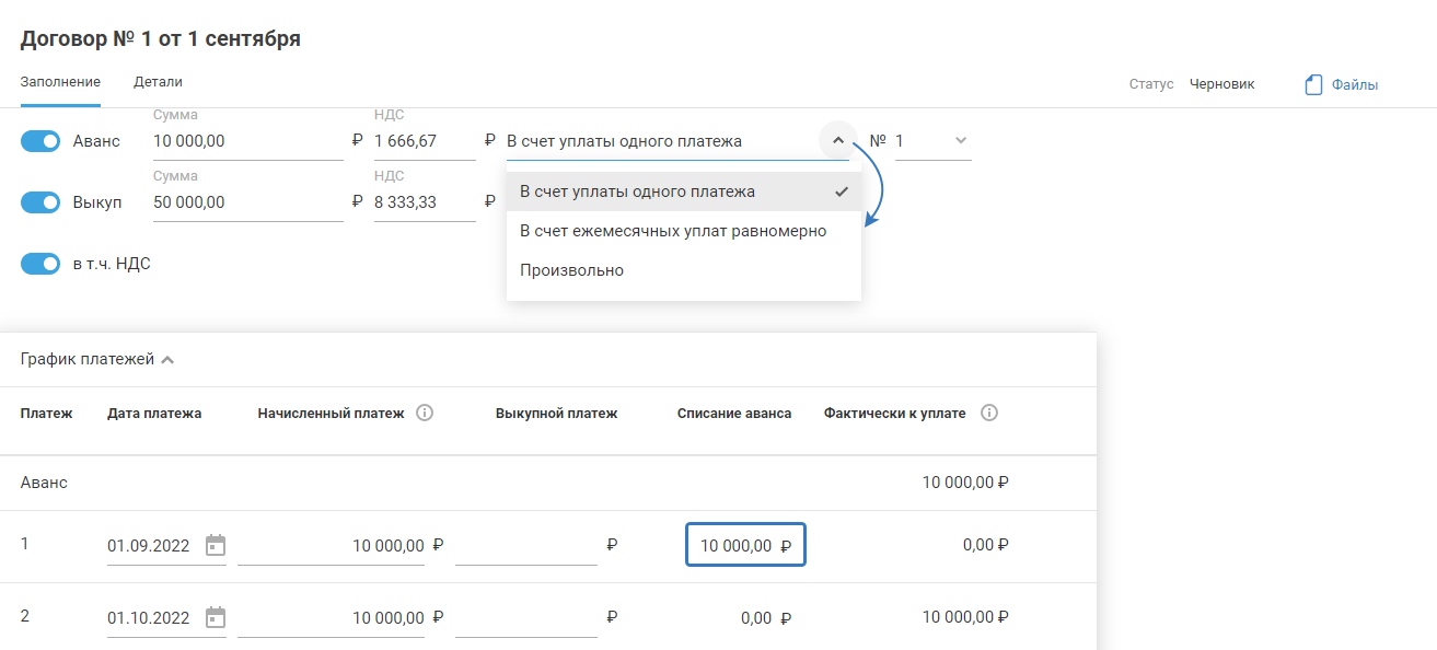 При произвольном зачёте аванса в детализации к графику платежей сумма аванса доступна для редактирования, заполните строки самостоятельно, если ни один из описанных выше вариантов вам не подходит. Например, если по условиям вашего договора зачёт авансового платежа происходит в счёт уплаты части первых или последних арендных платежей.
