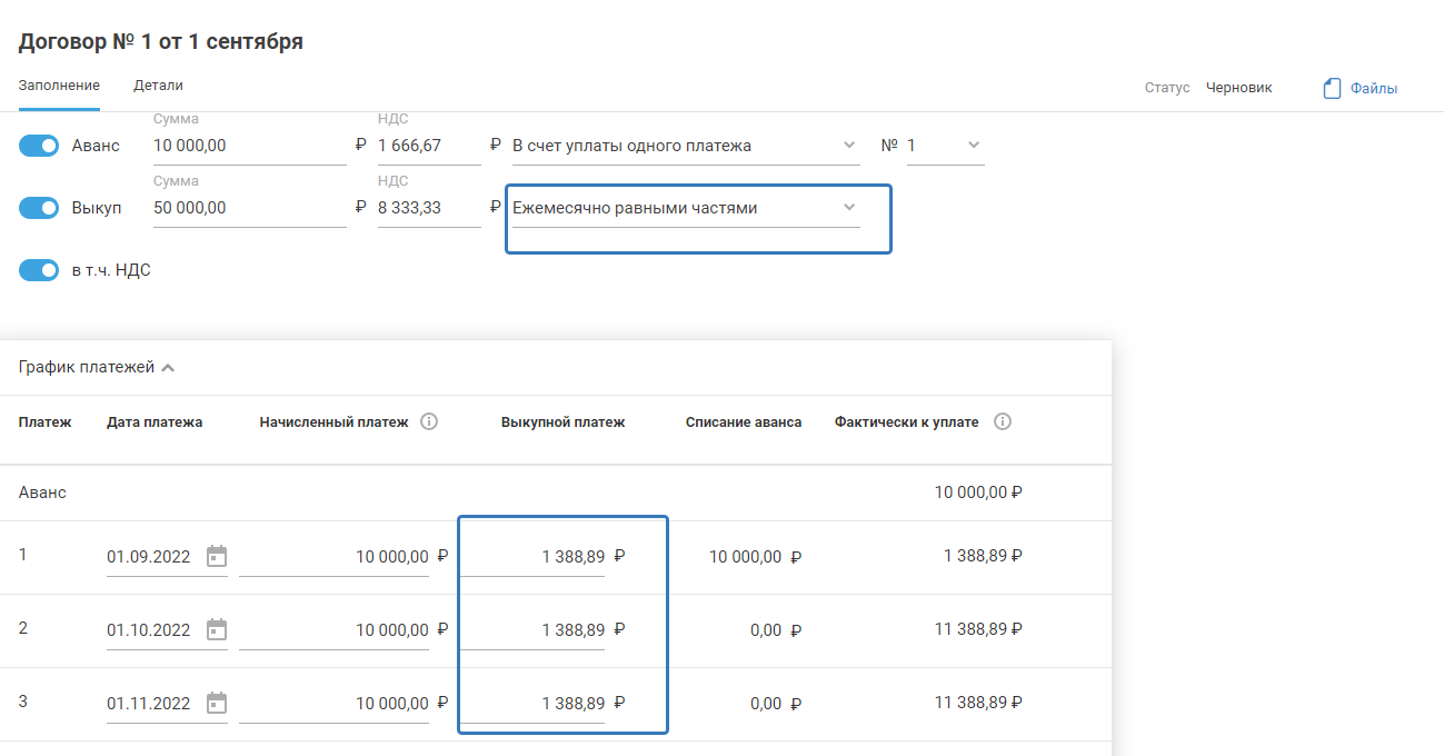 При ежемесячном платеже равными частями сумма ежемесячного платежа по выкупу определяется как отношение суммы выкупа к количеству месяцев действия договора. При этом сумма выкупа в детализации к графику платежей доступна для редактирования.