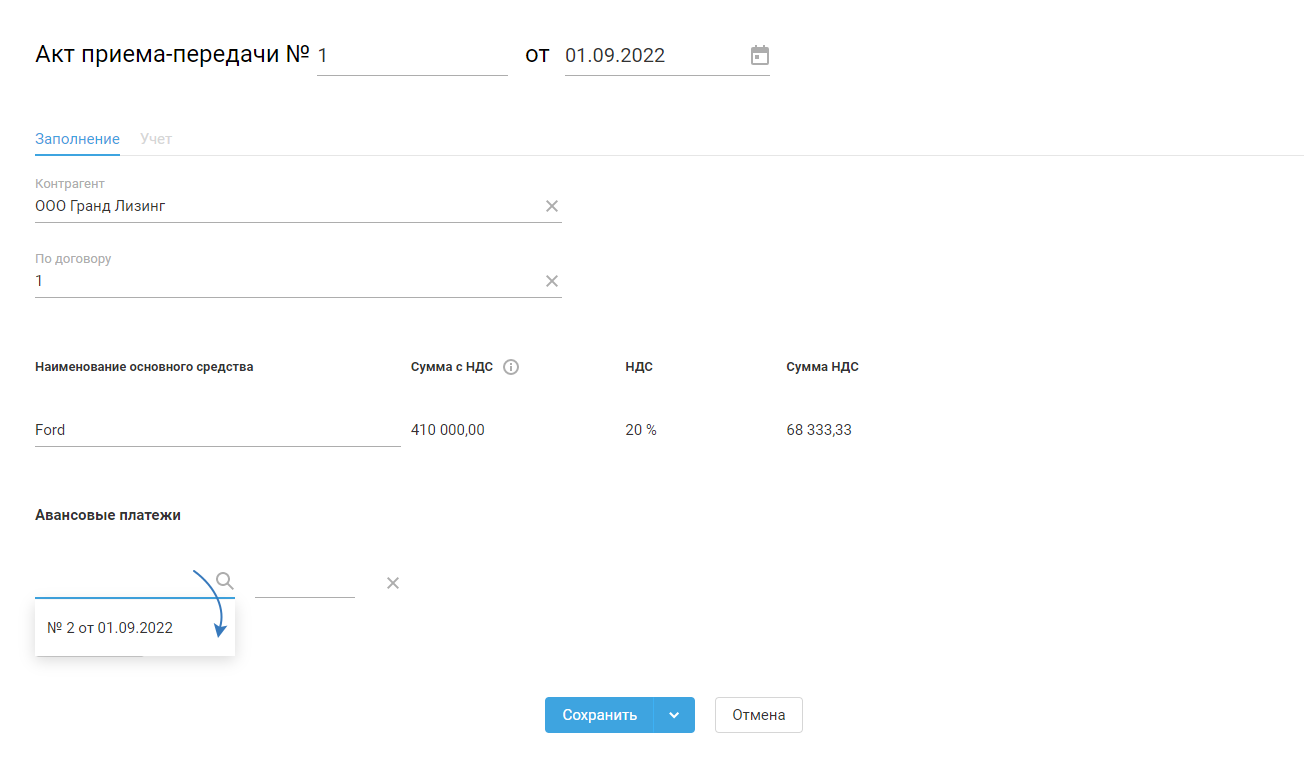 В блоке «Авансовые платежи» укажите авансовые платежи по договору аренды (лизинга). Для выбора доступны списания из раздела «Деньги» с типом «Оплата поставщику», в которых указаны те же Контрагент (отключите переключатель «Основной контрагент») и Договор, что и в акте приёма-передачи. Для привязки авансового платежа к акту приёма-передачи, нажмите на кнопку «+ Платёж» и выберите из списка платёжное поручение (расходный кассовый ордер, если оплата осуществлялась наличными), начав печатать его номер.