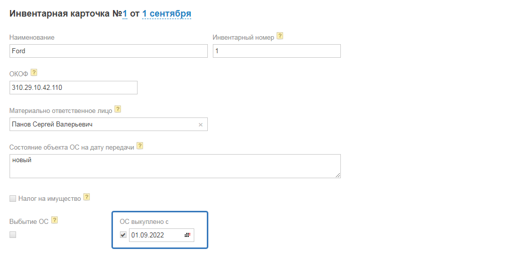 В строке «Выбытие ОС» поставьте галку и укажите дату продажи ОС, если данное имущество было реализовано, при этом дата выбытия ОС не может быть ранее даты инвентарной карточки.
