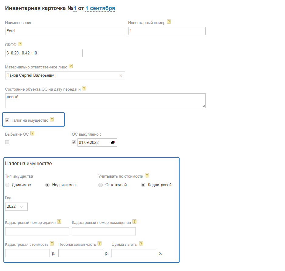 Блок «Налоговый учёт» зависит от системы налогообложения, а также было ли выкуплено основное средство или нет.