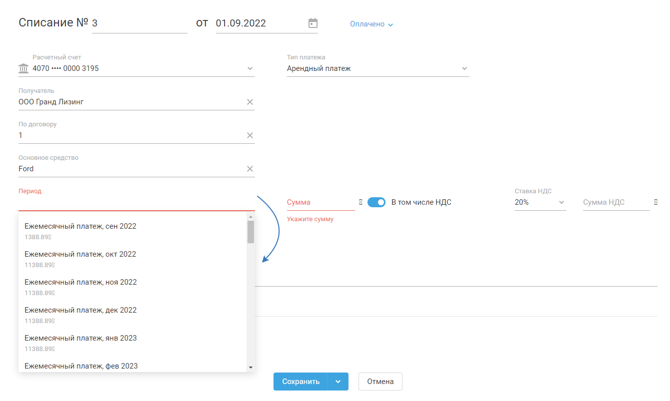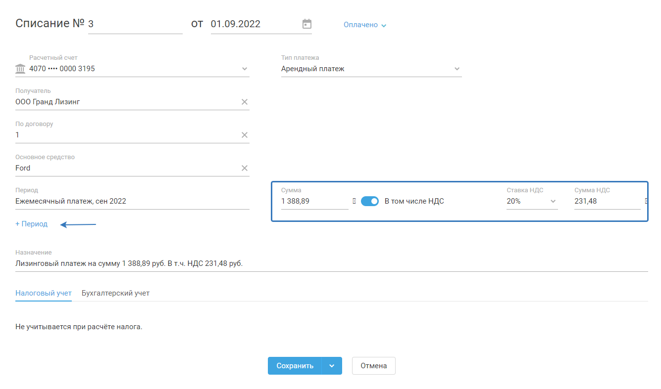 Для отражения в сервисе ежемесячного арендного платежа создайте в разделе «Деньги» списание с типом «Арендный платёж» и статусом «Оплачено». В поле «По договору» укажите договор аренды (лизинга), в строке «Период» укажите период начисления. В мастере закрытия месяца на шаге «Начисление амортизации и арендных платежей» во вкладке «Налоговый учёт» появится расход на наименьшую из сумм: сумма уплаченного арендного платежа и сумма арендного платежа по графику платежей в договоре.