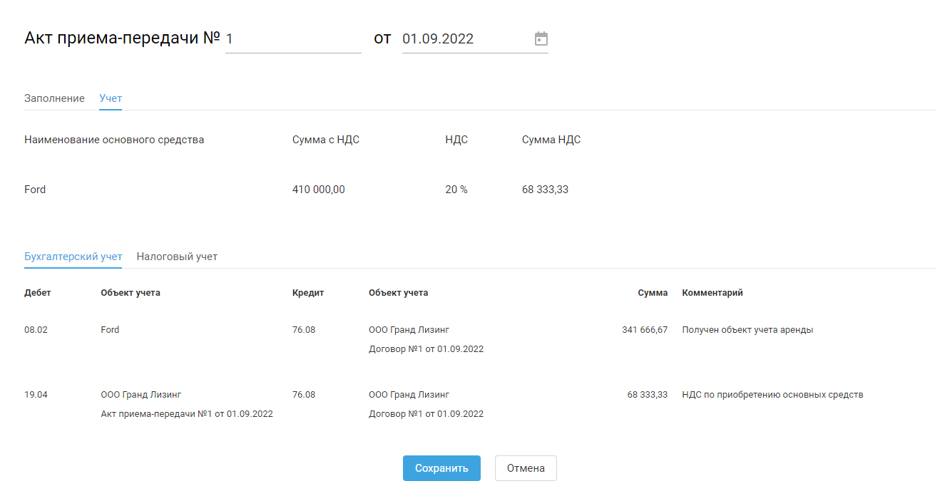 После сохранения акта откроется окно «Приобретение ОС в аренду». К объекту основного средства, приобретаемого в аренду (лизинг), можно привязать только один акт приёма-передачи. Значение в графе «Сумма» указывается как сумма по акту за вычетом НДС.