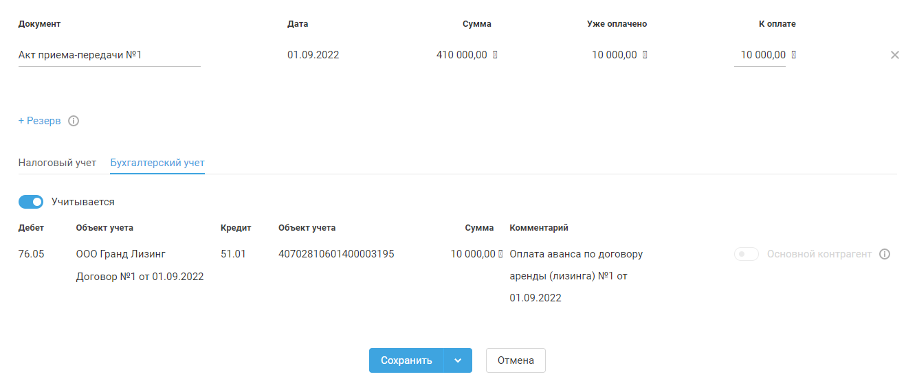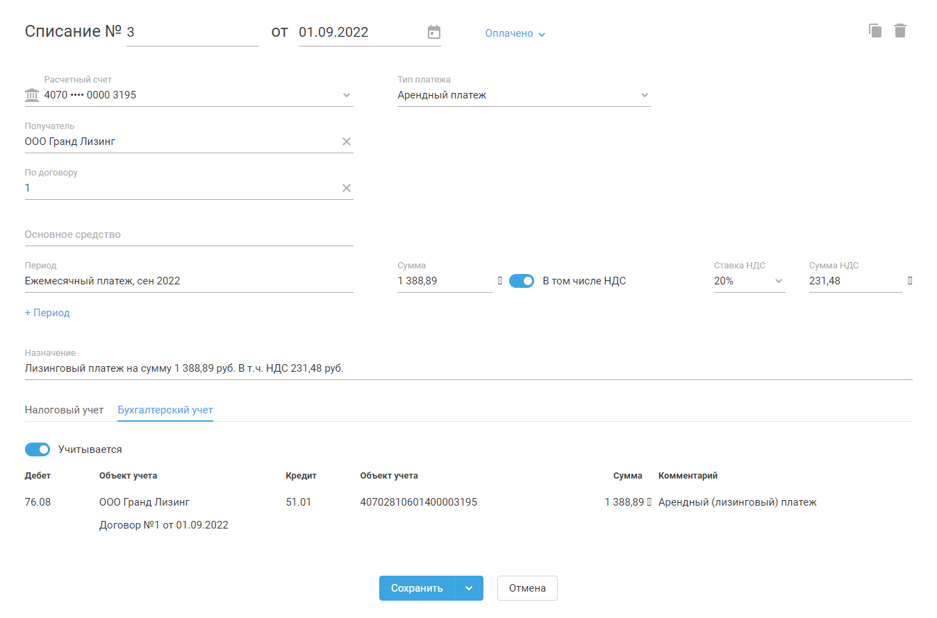 Сумма проводки — общая сумма платежей по договору аренды (лизинга).