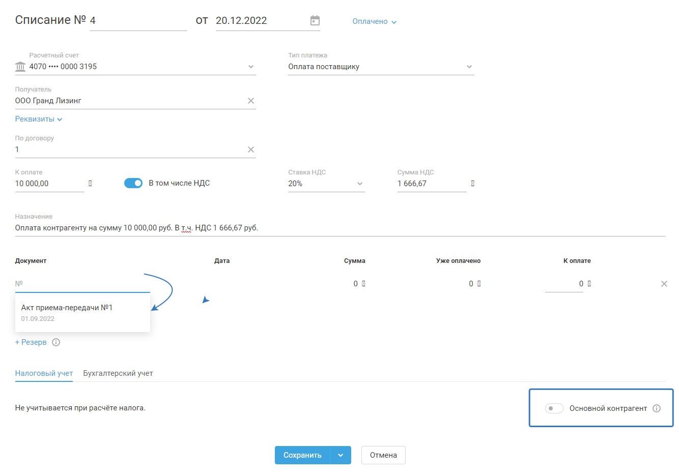 3. Если по договору предусмотрено перечисление авансового платежа, то отразите его как списание с типом «Оплата поставщику». Выключите переключатель «Основной контрагент».