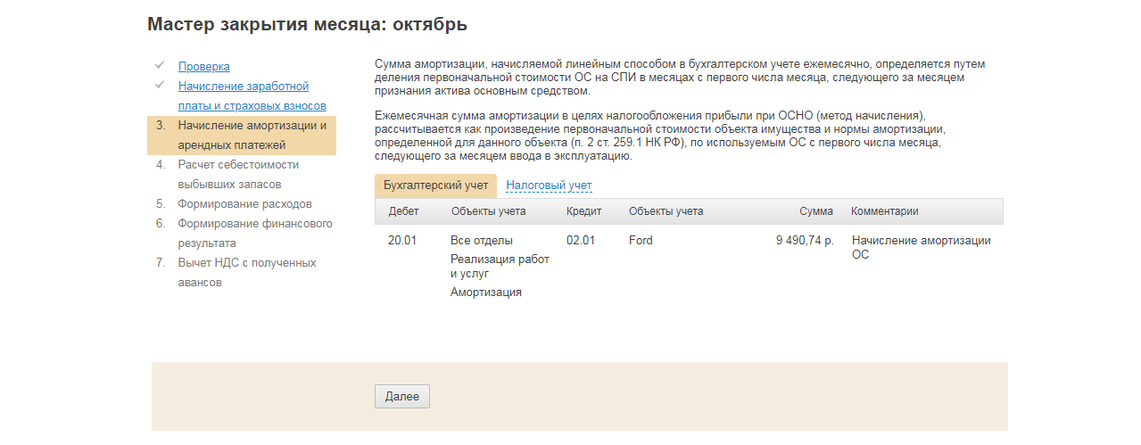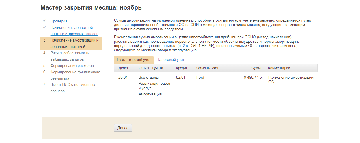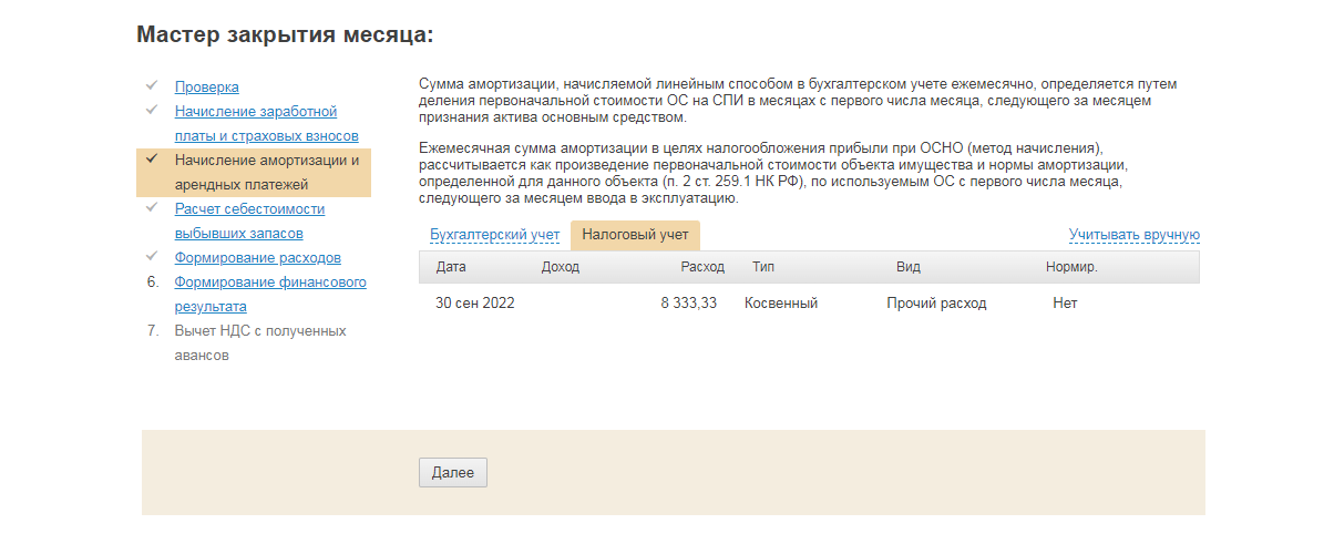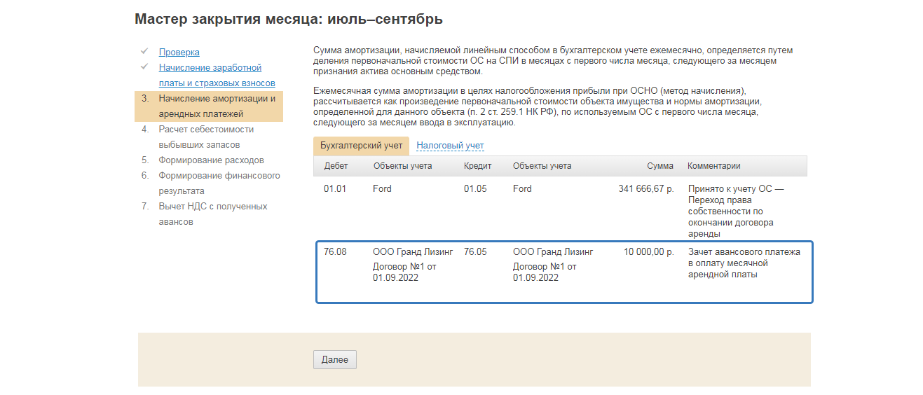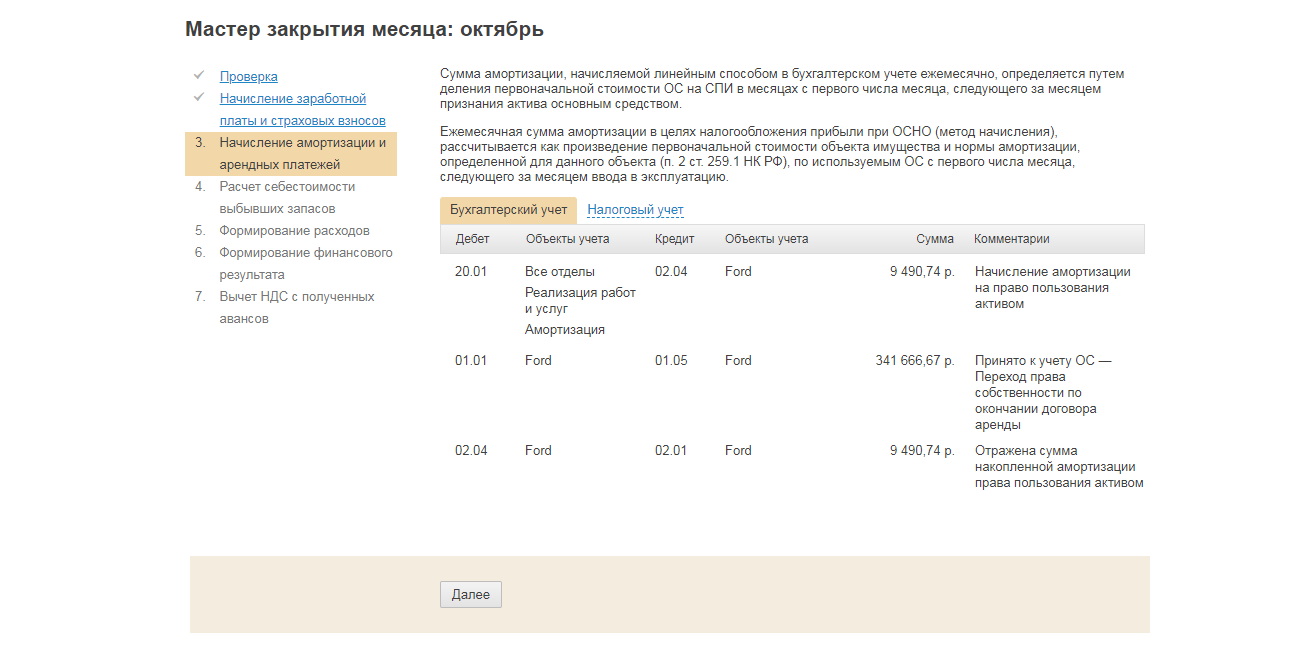 В мастере закрытия месяца на шаге «Начисление амортизации и арендных платежей» во вкладке «Налоговый учёт» появится расход
