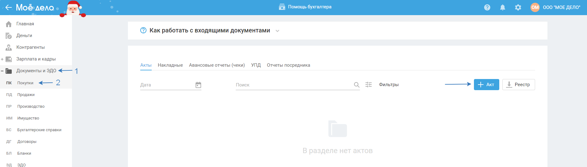 - признание расходов, в разделе Документы — Покупки — Акты с проводкой: