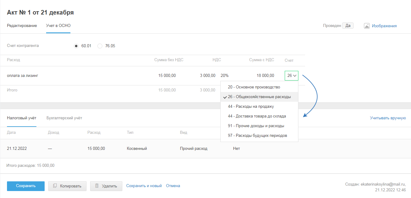 На основании отраженных в сервисе данных в бух. и налоговом учёте (для УСН 15%) вы сможете признать расходы на оплату лизингового имущества.