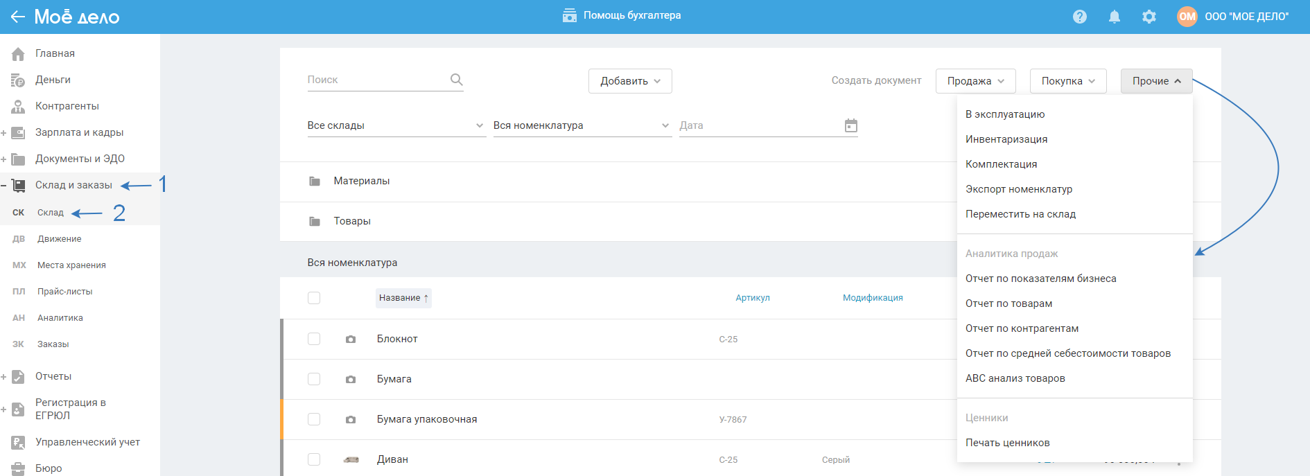 Для скачивания нужного отчёта необходимо перейти в раздел «Склад и заказы — Склад», нажать кнопку «Прочие», выбрать пункт «Аналитика продаж», выбрать отчёт, предварительно установив, период и склад, для которых должен быть сформирован отчёт.