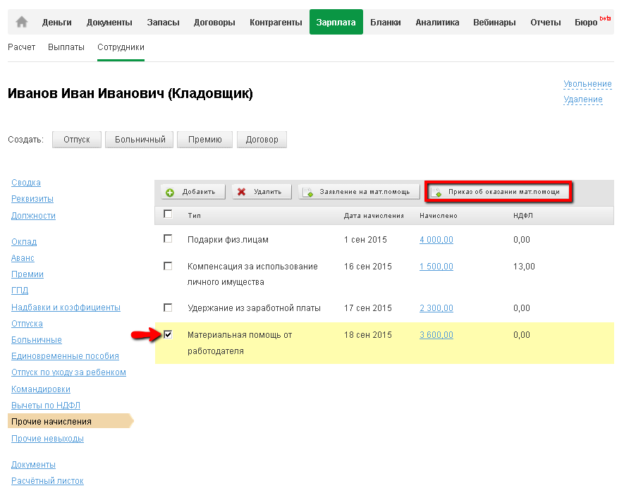 Чтобы скачать приказ об оказании материальной помощи, напротив строки с начислением с типом "материальная помощь от работодателя" нужно поставить галочку и нажать на кнопку "приказ об оказании мат.помощи".