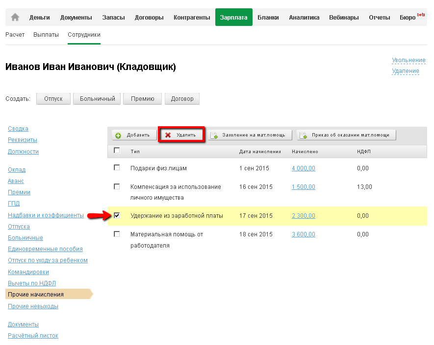 Чтобы удалить информацию о начислении (например, если она была добавлена по ошибке), напротив нужной строки нужно поставить галочку и нажать на кнопку "удалить".
