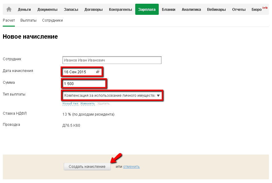 - дата начисления - укажите дату, когда было совершено данное начисление;