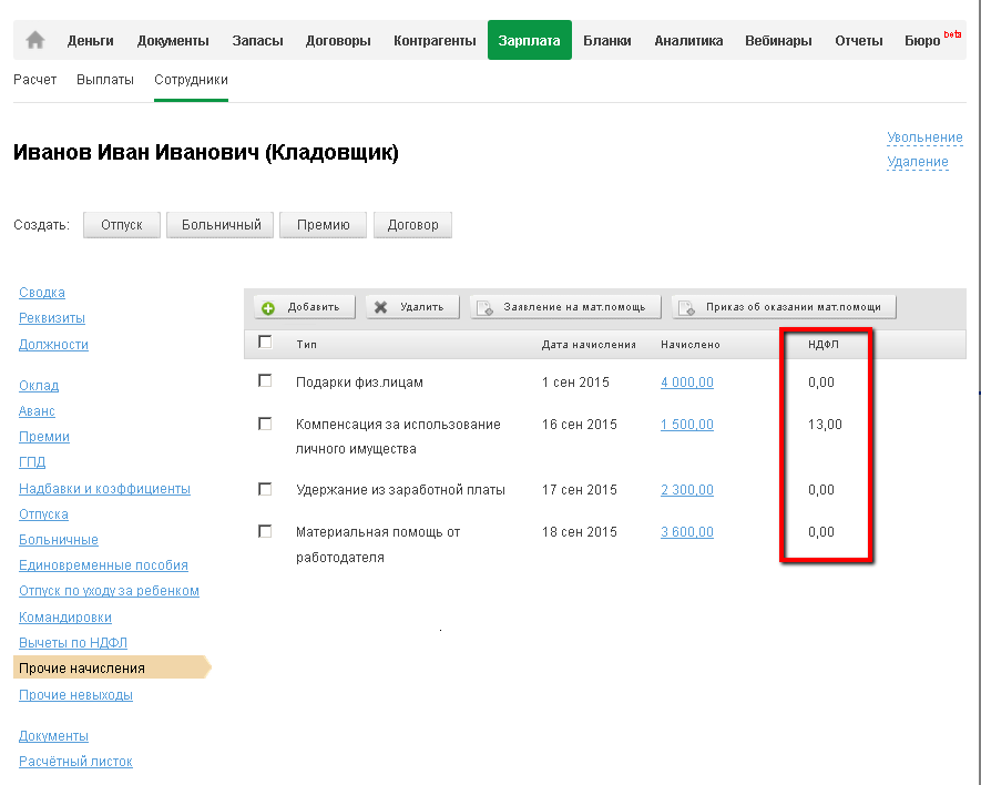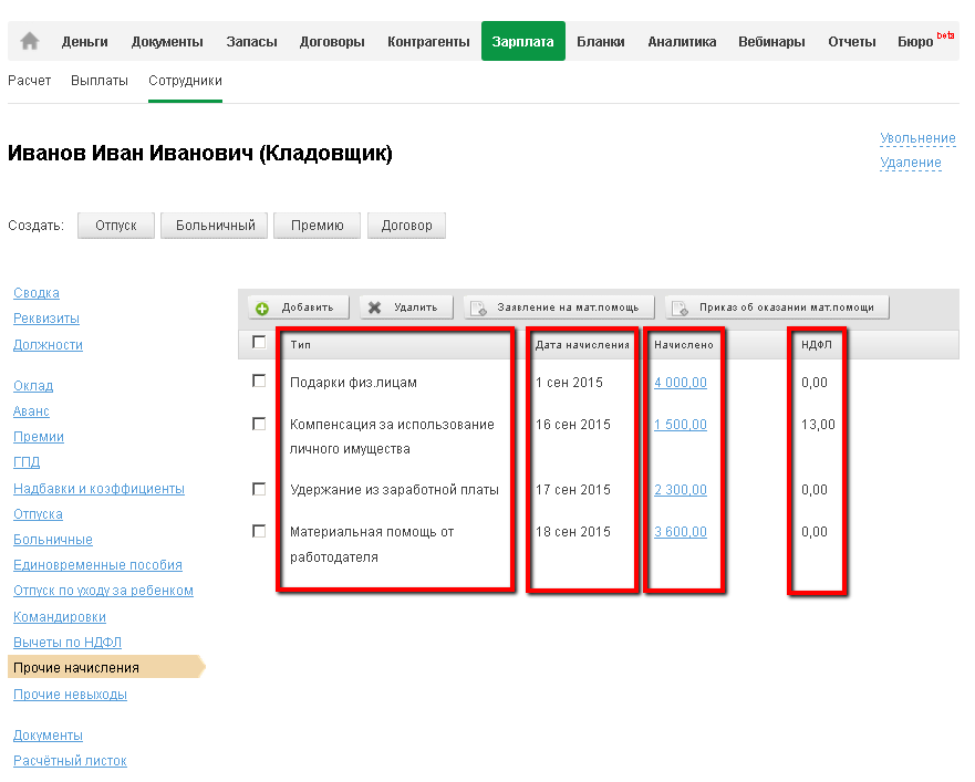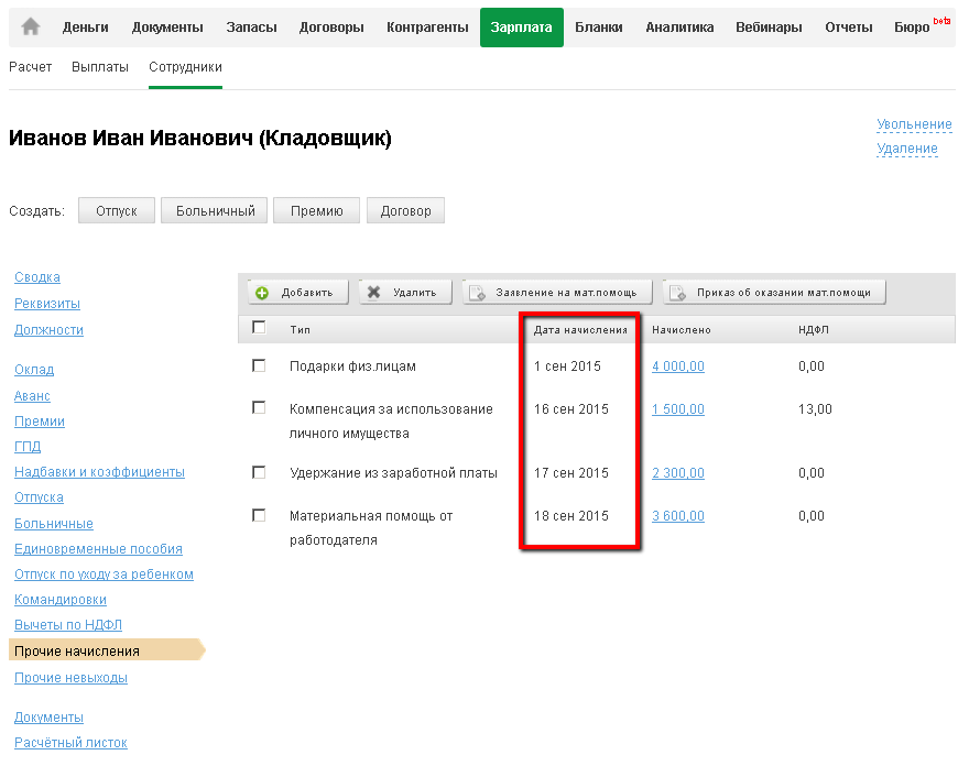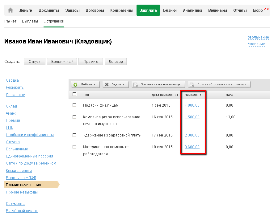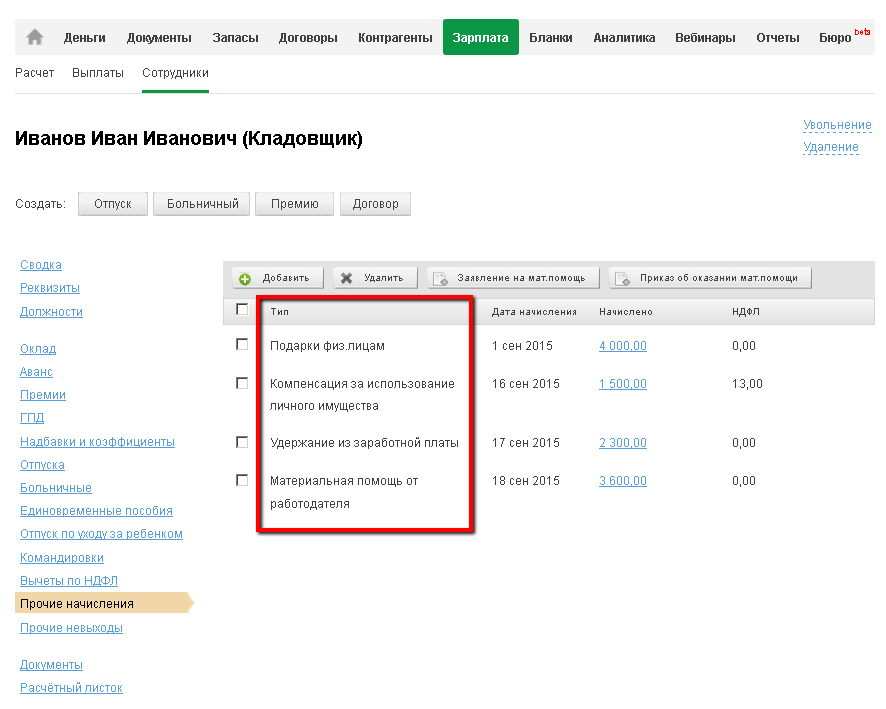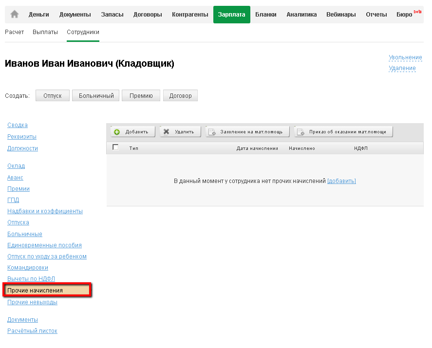 Для начала работы нужно перейти в пункт бокового меню - "прочие начисления".