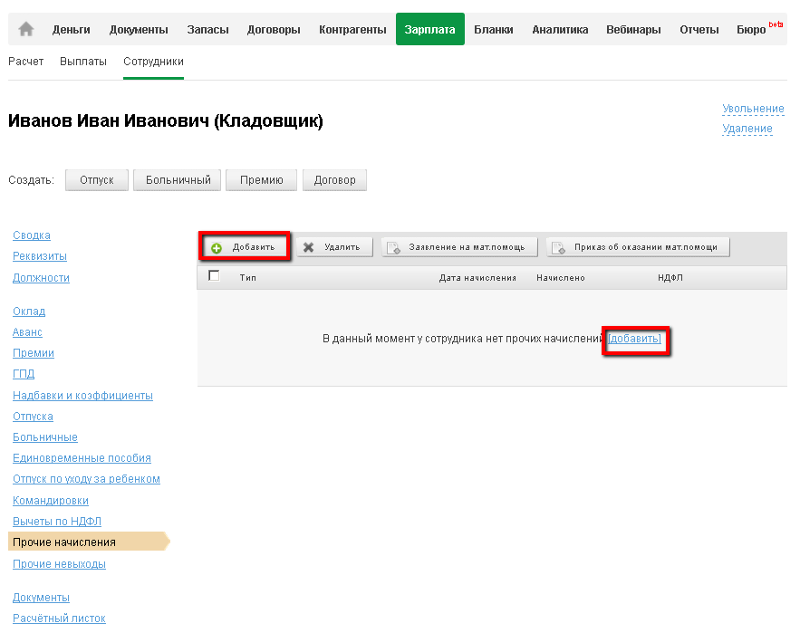 Чтобы добавить информацию о новом начислении нужно нажать на кнопку "добавить".