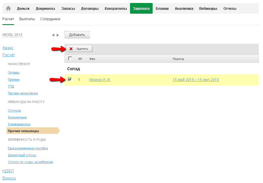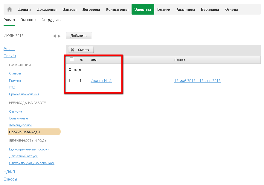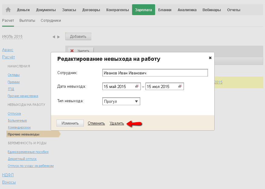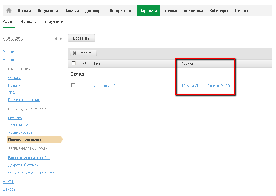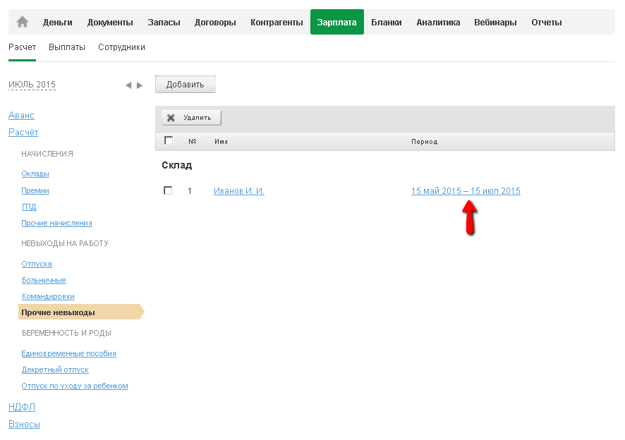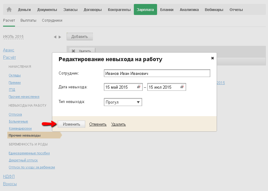 Внести изменения созданный прогул можно, нажав на активную ссылку по графе "Период".