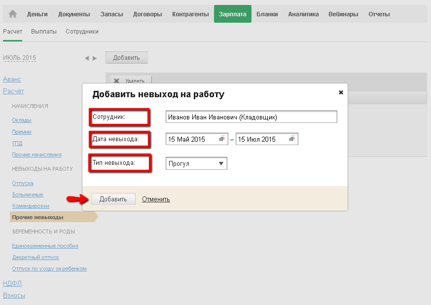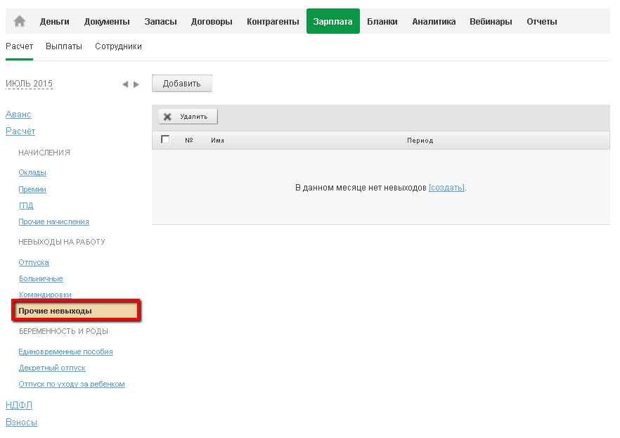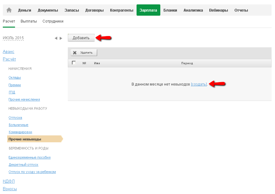 Для того чтобы отразить работнику прогул необходимо нажать на кнопку "Добавить" или активную ссылку "Создать".
