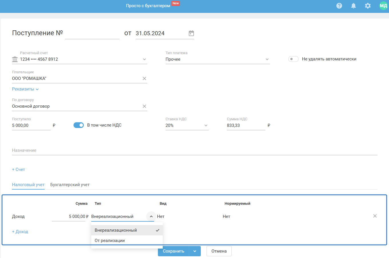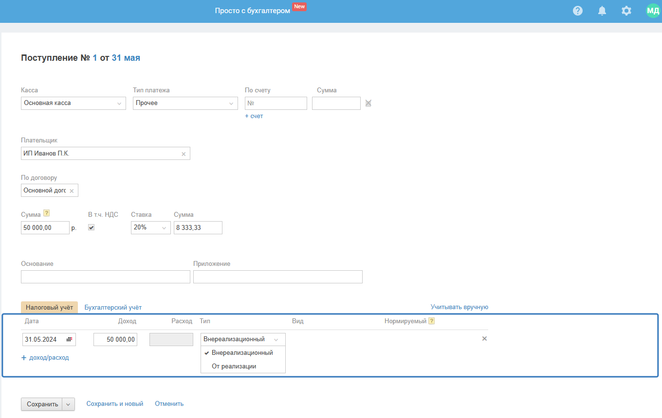 Укажите сумму дохода для целей налогообложения по налогу на прибыль организаций. Выберите тип «От реализации» или «Внереализационный». Если выбран «От реализации» укажите также «Вид».