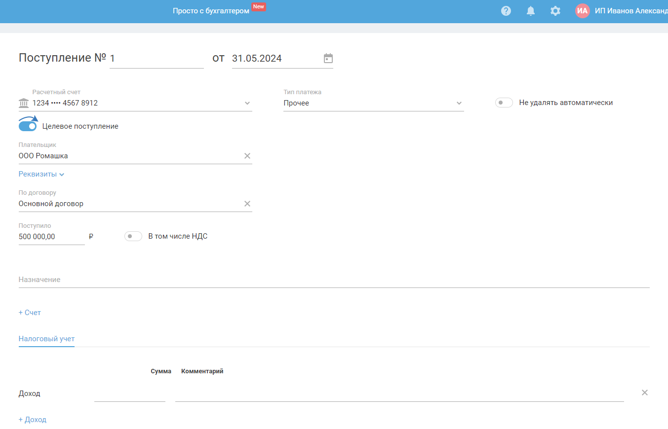 ИП на УСН в операциях поступления с типом «Прочее» при получении субсидии, гранта и др. могут указывать, что это целевое поступление. Для этого включите свитч (переключатель) «Целевое поступление»: