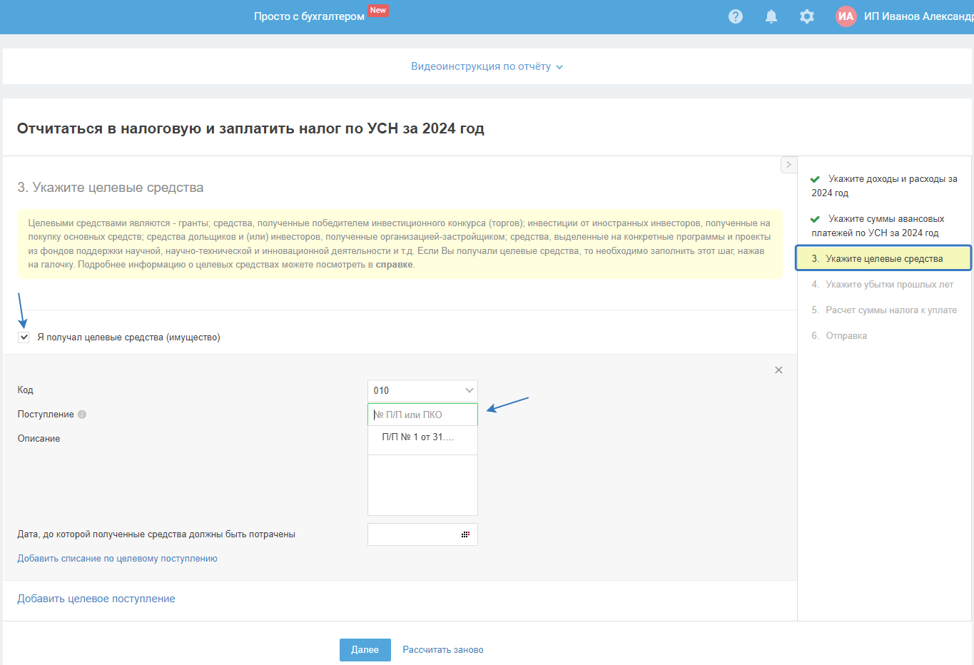 Далее при прохождении мастера по формированию декларации по УСН на шаге «Укажите целевые средства» в выпадающем списке вы уже будете видеть все сохранённые прочие поступления, у которых включен свитч «Целевое поступление».