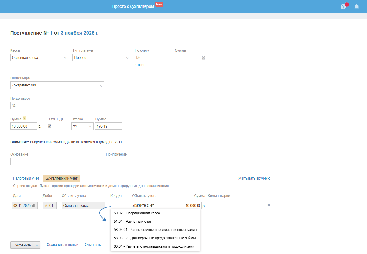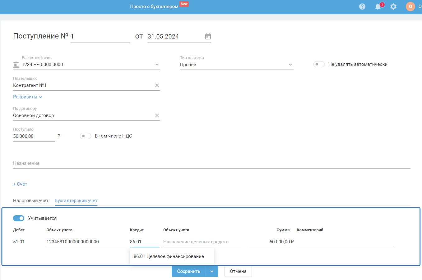 Обратите внимание. Для ООО в операциях поступления «Прочее» такой функционал не реализован, поэтому необходимо перейти в блок «Бухгалтерский учёт» и указать проводку: Дт 51 — Кт 86:
