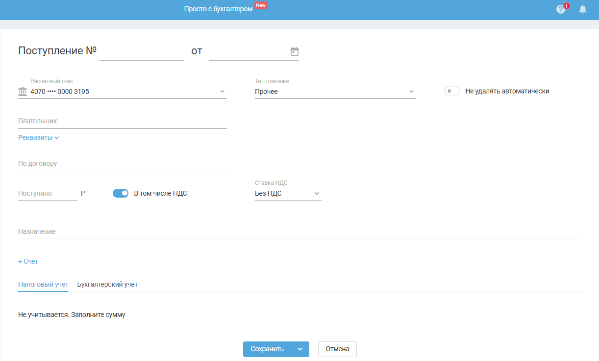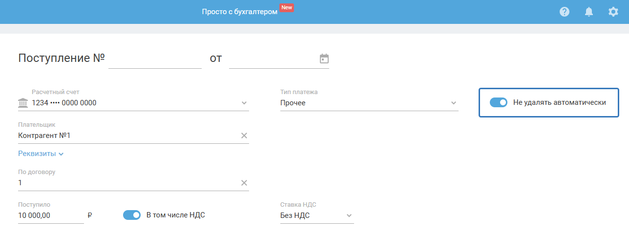 - входящее платёжное поручение с типом «Прочее» (при безналичном поступлении денежных средств);